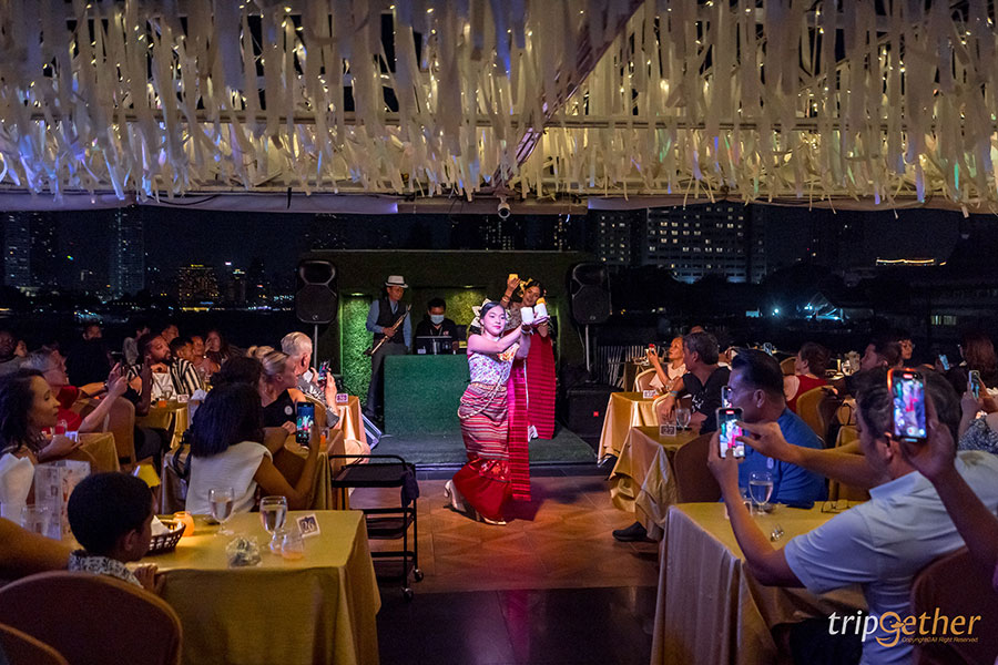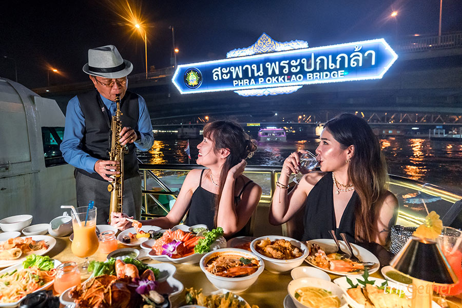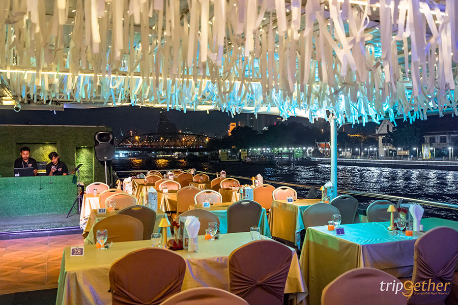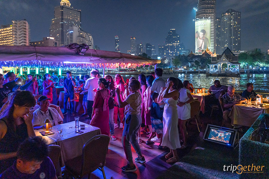 ตลอดการล่องเรือเจ้าพระยา นอกจากจะมีบุฟเฟ่ต์อาหารและบรรยากาศสวยๆ ที่ขาดไม่ได้ก็คือความครึกครื้น บนเรือจะมีนักร้องและนักดนตรีคอยเอนเตอร์เทน สร้างความสนุกสนาน ทั้งร้องทั้งเต้นกันแบบเต็มที่ สำหรับเพลงที่เปิดก็มีหลากหลาย ส่วนใหญ่เป็นเพลงสากล มีทั้งหวานซึ้ง แดนซ์มันส์ๆ หรือเพลงละตินให้ได้ออกสเต็ป ส่วนใครอยากรีเควสเพลงก็ได้เหมือนกัน บอกเลยว่าเหมาะกับการมาเซอร์ไพรส์วันพิเศษหรือฉลองวันเกิด แถมใครที่มีวันเกิดในเดือนนั้น ได้กินเค้กฟรีด้วยนะ!