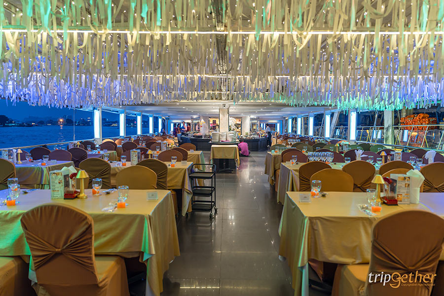 เรือที่เราขึ้นชื่อว่า เรือเจ้าพระยาครุยส์ (The Grand Chaophraya Cruise) เป็นเรือสำราญลำใหญ่ 2 ชั้น ตกแต่งมาอย่างหรูหราและเต็มไปด้วยบรรยากาศอันแสนพิเศษ เริ่มจากชั้นดาดฟ้าที่เป็นมุมยอดฮิต แบ่งเป็น 2 ส่วนหลักๆ คือ Open Air และ In-Door Air โดยที่นั่งทั้งหมดจะเป็นแบบเปิดโล่ง เหมาะกับการมานั่งรับลมชิลล์ๆ และเห็นวิวทั้งสองฝั่งแม่น้ำเจ้าพระยาได้อย่างกว้างๆ และแนะนำสำหรับสายคอนเทนต์ให้จองชั้นดาดฟ้าบริเวณ Open Air ไว้เลย รับรองว่าได้ถ่ายรูปกลับไปอัปโซเชียลเพียบ