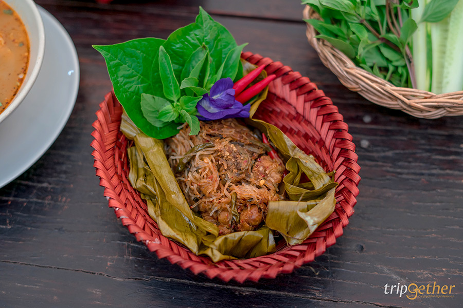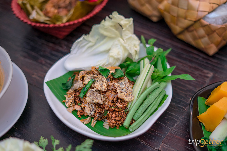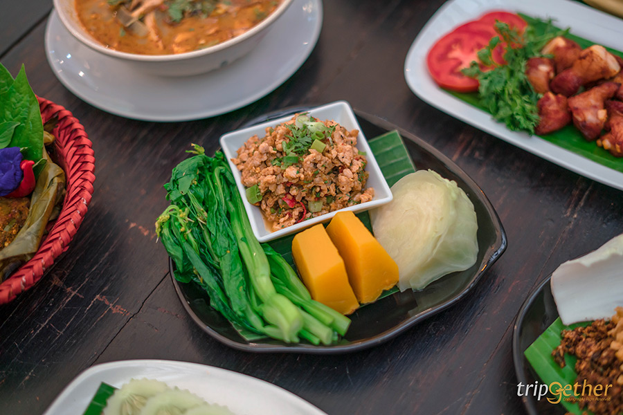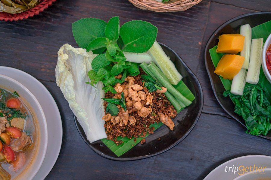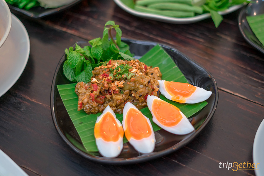 เมนูอาหารเหนือประเภทลาบหรือยำพื้นเมืองก็มีให้เลือกแบบเน้นๆ อย่าง ตำมะเขือยาวฉ่ำๆ ที่เสิร์ฟมาพร้อมไข่ต้มยางมะตูม