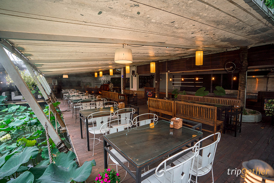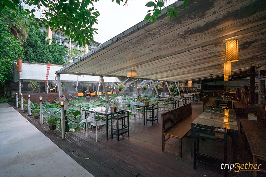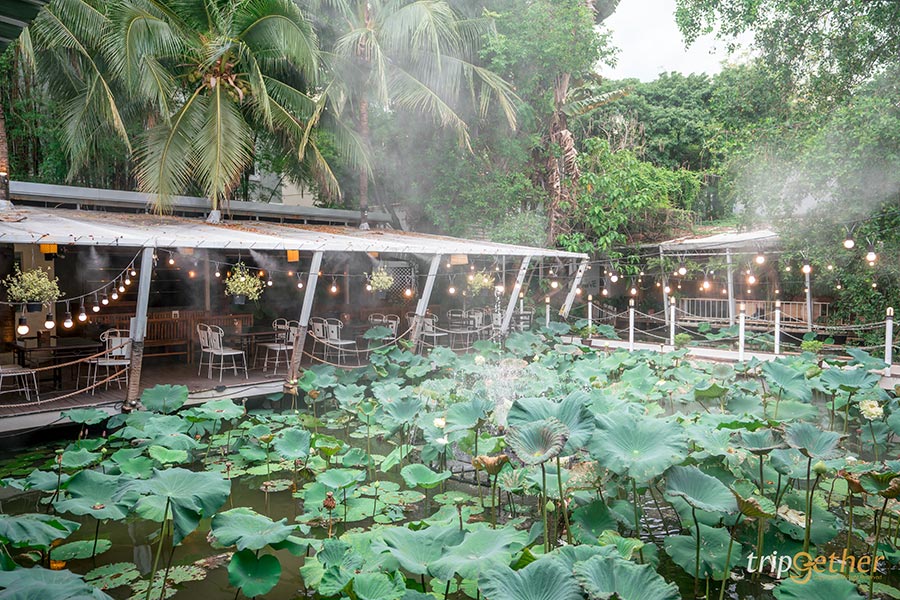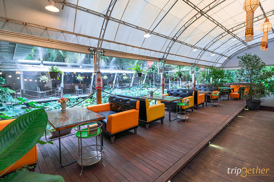 โซนที่นั่งมีให้เลือกทั้งแบบชุดเก้าอี้ติดริมสระบัว หรือจะนั่งโซฟาสบายๆ แต่ถ้ามากันเป็นครอบครัวใหญ่ก็สามารถเลือกนั่งโต๊ะยาวได้เลย ที่สำคัญทุกโซนร่มรื่นสุดๆ มองไปทางไหนก็สบายตา