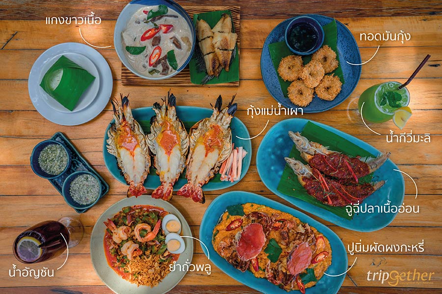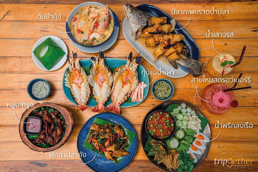 ต่อด้วยเมนู ต้มยำกุ้ง ราคา 260 บาท เป็นต้มยำกุ้งน้ำข้นรสชาติจี๊ดจ๊าด เปรี้ยวเค็มเผ็ดแบบครบรส ใส่กุ้งแม่น้ำตัวใหญ่มาแบบเน้นๆ ใครเลิฟต้มยำกุ้งบอกเลยว่าห้ามพลาด นอกจากนี้ยังมีเมนูแซ่บๆ อย่าง น้ำพริกลงเรือ ราคา 260 บาท เมนูอาหารไทยที่ใครได้กินก็ต้องติดใจ เสิร์ฟมาคู่กับเครื่องเคียงมากมาย ทั้งไข่เค็ม มะเขือ แตงกวา กระเทียม ถั่วพลู และผักทอดต่างๆ