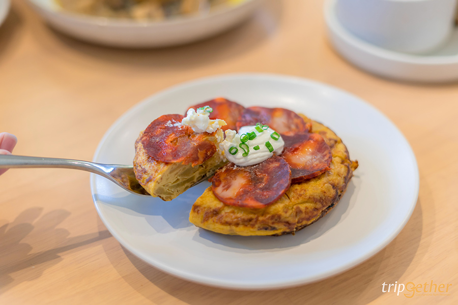Tortilla de Patatas y Chorizo เมนูไข่เจียวสเปนที่นับว่าเป็นเมนูชื่อดัง และเต็มไปด้วยกลิ่นอายต้นตำรับสเปนแท้ๆ เนื้อไข่นุ่มและหอม ภายในยัดไส้ด้วยมันฝรั่งสุดเนียนนุ่มที่ผ่านการต้มในน้ำมันด้วยไฟอ่อน เพิ่มความหวานกำลังดีด้วยหัวหอมที่นำไปผัดกับคาราเมลหรือการคาราเมลไลซ์ (Caramelized) ด้วยการใช้ไฟอ่อนจนงวดได้ที่ ตัดรสชาติด้วยไส้กรอก Chorizo ไส้กรอกสไตล์สเปนที่ออกรสเค็มเล็กน้อย ท็อปด้วย cream fresh ที่เป็นครีมเข้มข้น เมื่อกินพร้อมกันก็จะสัมผัสได้ถึงรสชาติที่เข้าได้เป็นอย่างดีในหนึ่งคำ ราคาเพียง 250 บาท