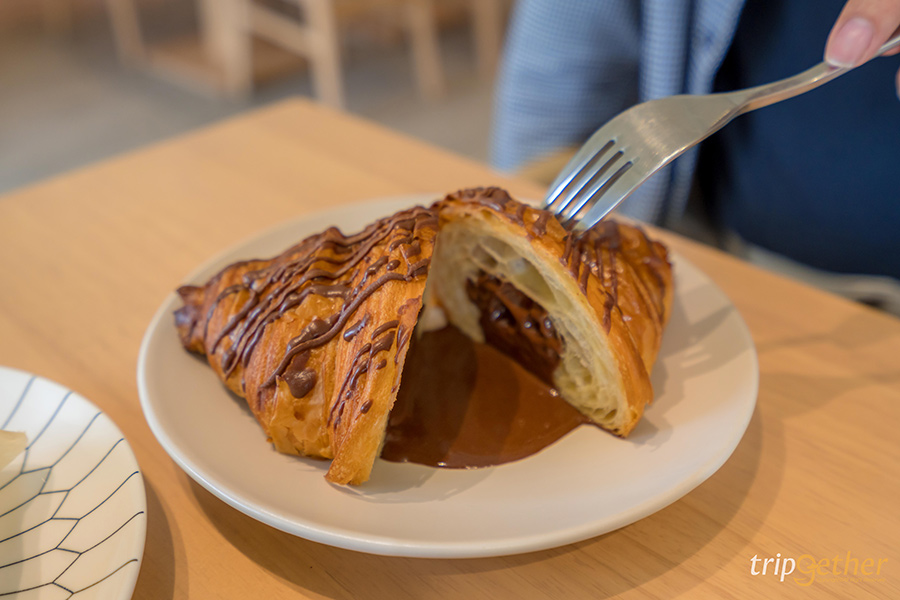 Double Chocolate Croissant ที่จัดเต็มความอร่อยโดยใช้ช็อกโกแลต Saint Dominigue และช็อกโกแลต Dulce ที่ให้สัมผัสถึงความเป็นนมและคาราเมล ผสมผสานความกลมกล่อมด้วยดาร์ก รัม ตัวครัวซองต์เสิร์ฟมาร้อนๆ โดยมีไส้ช็อคโกแลตลาวาที่ไหลเยิ้มอยู่ภายใน ราคาเพียง 170 บาทเท่านั้น