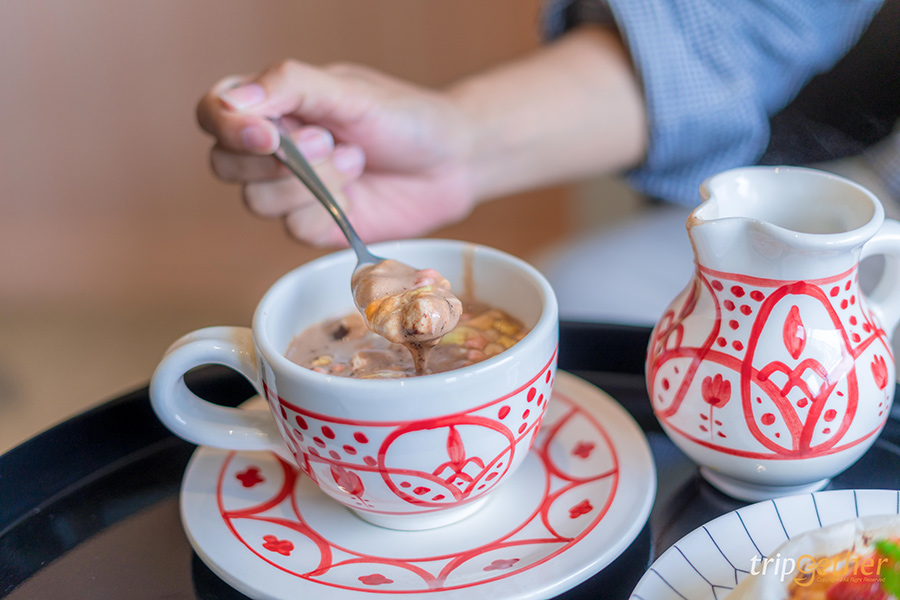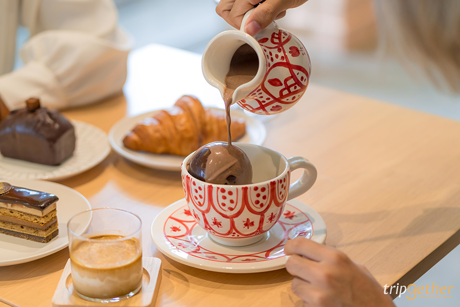 มาต่อกันกับเมนูเครื่องดื่มที่ทางร้านคัดสรรวัตถุดิบชั้นดี พิถีพิถันแบบแก้วต่อแก้วอย่าง Chocolate Signature เมนูช็อคโกแลตร้อน ที่เสิร์ฟมาในแก้วที่มีลวดลายเฉพาะตัวที่นำเข้าจากสเปน โดยความโดดเด่นของเมนูนี้จะมี chocolate bomb ซึ่งจะใช้ช็อกโกแลตที่มีความเข้มข้นถึง 70% ภายในมีมาร์ชเมลโลอยู่ 2 ชนิด คือมาร์ชเมลโลที่ให้ความนุ่ม หวานละมุน และมาร์ชเมลโลที่มีความหนึบ มาพร้อมกับช็อกโกแลตร้อนที่นำเข้าจากสเปน มีความโดดเด่นคือให้สัมผัสถึงความนุ่มและเข้มข้นจากโกโก้ วิธีกินก็คือราดช็อกโกแลตร้อนจากเหยือกลงบน chocolate bomb เมื่อละลายแล้วมาร์ชเมลโลภายในก็จะลอยขึ้นมา เมนูนี้อยู่ที่ 260 บาท