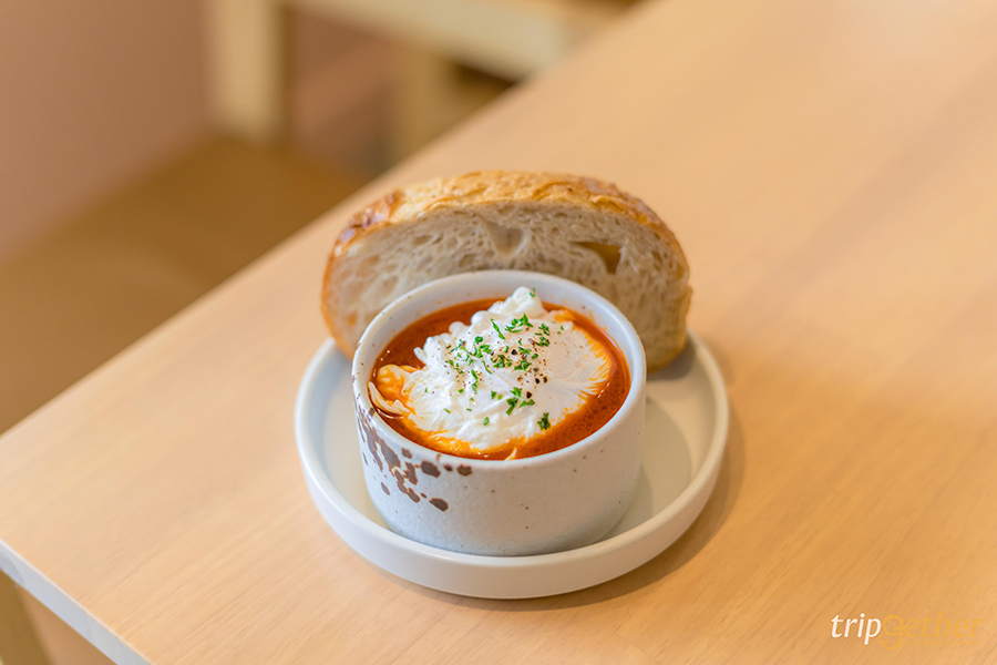 Sopa de Garbanzos เมนูซุปถั่วสไตล์สเปน ที่ใช้ถั่วลูกไก่ (Chickpeas) ท็อปด้วยไข่ดาวน้ำ (Poach eggs) เสิร์ฟมาพร้อมกับขนมปังโฮลวีทซาวโดวจ์ที่ใช้ยีสต์ของทางร้านที่หมักเอง ทำให้ขนมปังมีความเหนียวนุ่ม อิ่มท้อง ย่อยง่าย แต่ไม่รู้สึกอืดท้อง วิธีกินก็เพียงฉีกขนมปังให้พอดีคำ จากนั้นก็จิ้มลงไปผ่านไข่ดาวน้ำและซุปพร้อมๆ กัน ราคา 190 บาท (หากเพิ่ม poach eggs เพิ่ม 50 บาท)