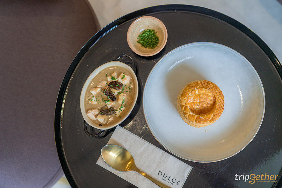 Chicken Vol Au Vent เมนูอาหารชั้นเลิศจากฝรั่งเศส ที่มีแป้งพัฟซึ่งรังสรรค์ด้วยเทคนิค invert puff pastry ทำให้พัฟมีความกรอบและเบา ใช้แป้งที่นำเข้าจากอิตาลี พร้อมทั้งอกไก่ที่ผ่านการซูวี (sous vide) ที่กักเก็บสารอาหาร ความนุ่มชุ่มฉ่ำไว้ได้อย่างครบถ้วน ราดด้วยซอสเห็ดสุดพิเศษ โดยตัวซอสใช้เห็ดที่มีรสสัมผัสและกลิ่นที่แตกต่างกันถึง 3 ตัว คือเห็ดหอม เห็ดออริลจิ และเห็ดโมรอล ซึ่งเป็นเห็ดที่มีเอกลักษณ์ของอาหารฝรั่งเศส รวมทั้งน้ำมันมะกอก Extra Virgin Olive Oil ราคาความอร่อยนี้อยู่ที่ 450 บาท