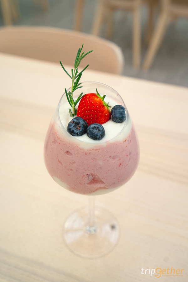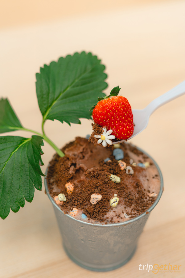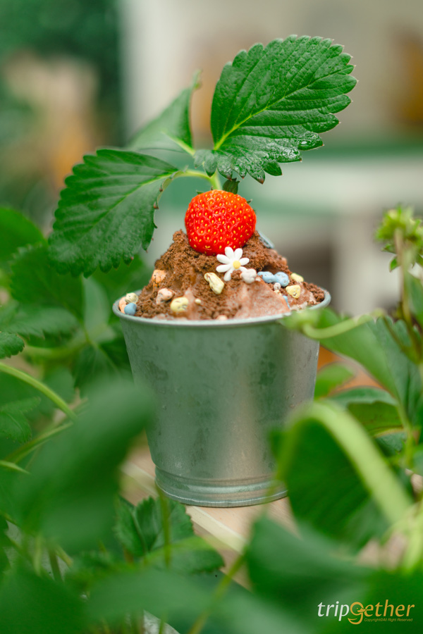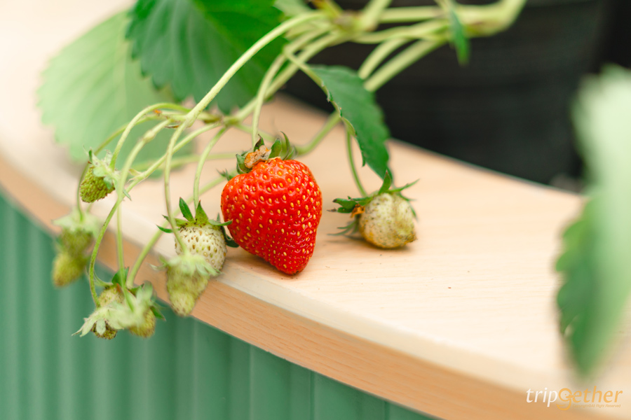 มาต่อกันกับโซนที่นั่ง เมื่อเข้ามาถึงตัวร้าน เราก็จะพบกันโถงกว้างที่มีความสว่างและโล่งโปร่ง พร้อมกับมีต้นสตรอว์เบอร์รีประดับตกแต่งอยู่ตามมุมต่างๆ ของร้านอีกด้วย บอกเลยว่าเพียงแค่ได้ลองเดินผ่าน หรือสัมผัสผลสตรอว์เบอร์รีก็ได้กลิ่นหอมหวานติดมือออกมาด้วยกันเลยทีเดียว