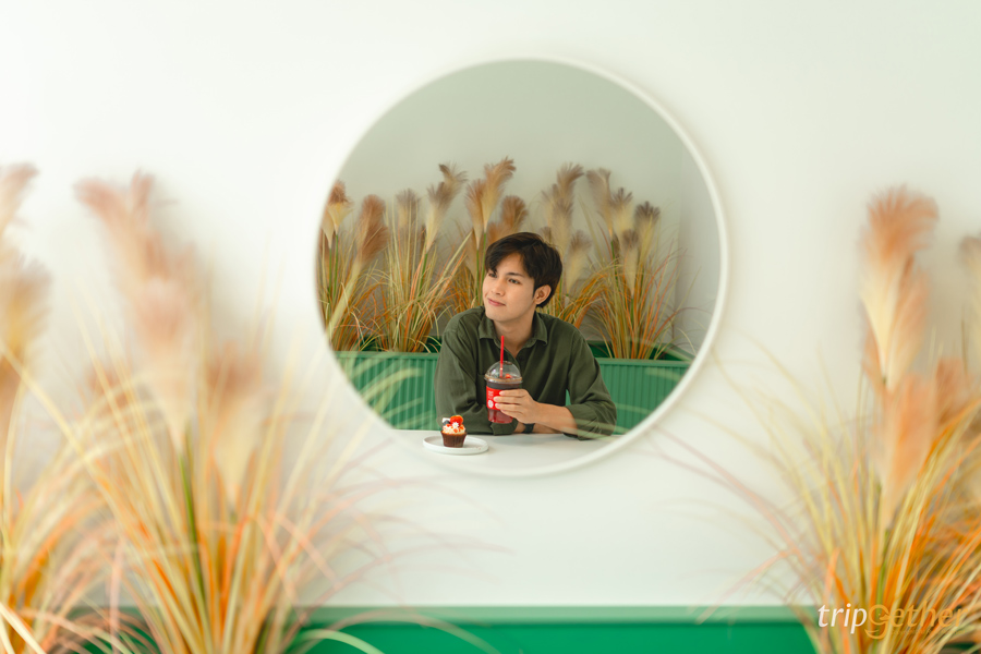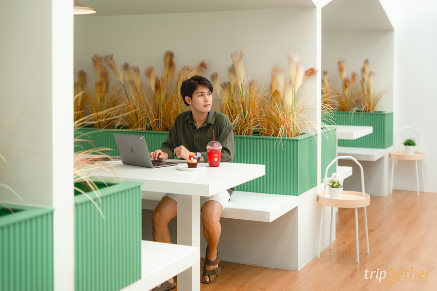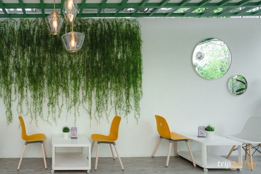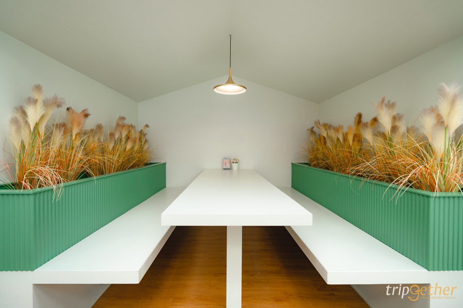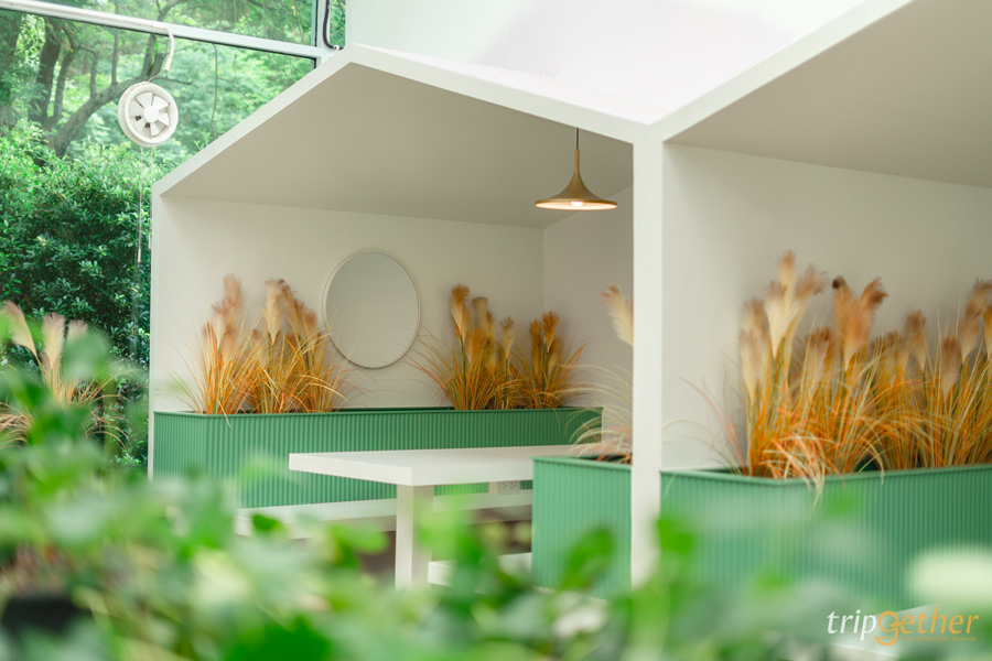 โซนที่นั่งที่รับรองว่าสายโซเชียลจะต้องถูกใจ นั่นก็คือ โซนซุ้มมินิมอล ที่มาพร้อมกับที่นั่งภายใต้ซุ้มทรงจั่วสามเหลี่ยม ตกแต่งด้วยดอกหญ้าเทียม เรียบง่าย แต่เต็มไปด้วยเสน่ห์ บอกเลยว่าสั่งเครื่องดื่มมาวางบนโต๊ะ แล้วโพสท่าเก๋ๆ รูปที่ถ่ายออกมาได้ฟีลญี่ปุ่นสุดๆ