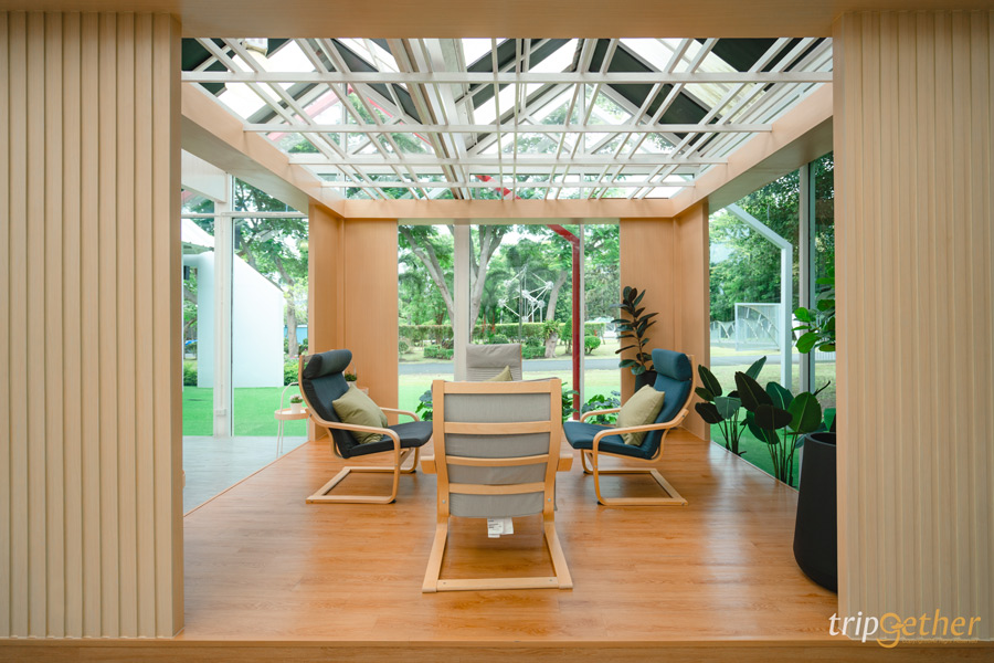 โซนบ้านญี่ปุ่น โดดเด่นด้วยโครงไม้สีน้ำตาล มาพร้อมกับเก้าอี้แบบเอนหลัง ตั้งอยู่มุมร้านที่มีกระจกใสบานใหญ่ที่สามารถมองเห็นถึงความร่มรื่นภายนอกได้แบบชิลล์ๆ