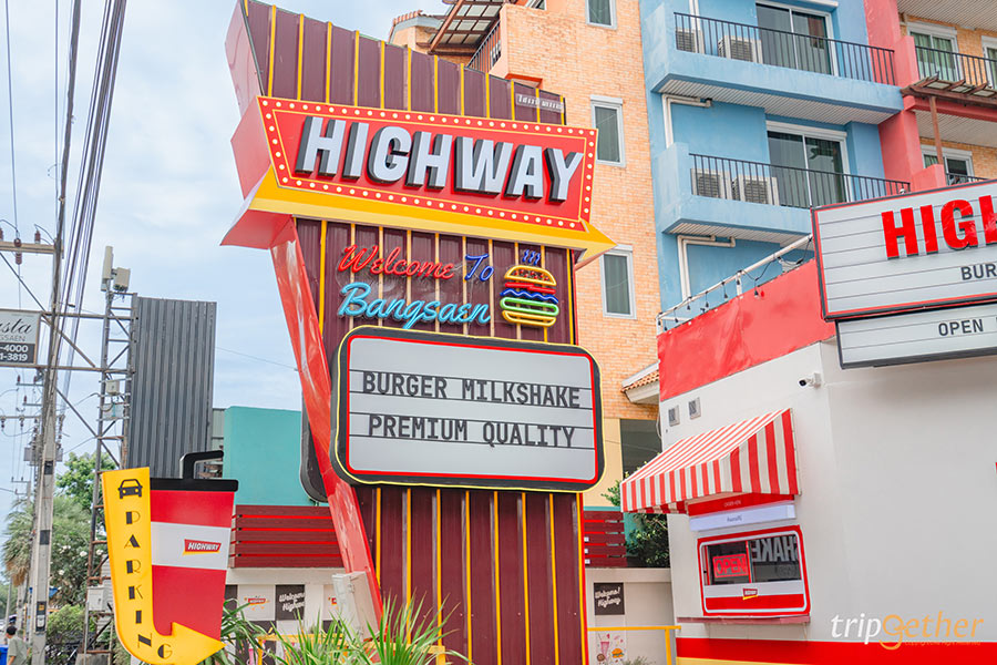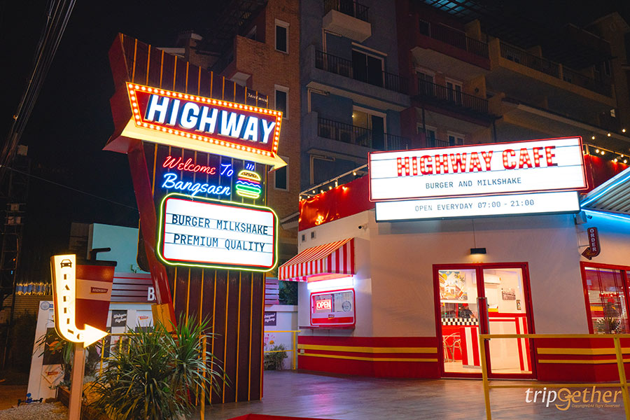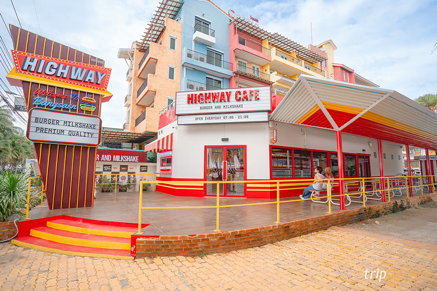 Highway Cafe บางแสน ถือว่าเป็นอีกหนึ่งจุดแลนด์มาร์กของบางแสนที่มีคอนเซ็ปต์เด่นชัด ใครชอบสไตล์ American Retro ห้ามพลาดเด็ดขาด บรรยากาศในร้านสนุกสนาน ตอบโจทย์การมานั่งแฮงค์เอาท์กับแก๊งค์เพื่อน มาพูดคุยชิลล์ๆ เอ็นจอยกับมื้ออาหาร หรือจะมาเช็คอินถ่ายรูปชิคๆ บอกเลยว่ามุมถ่ายรูปเยอะมาก! นอกจากนี้ยังได้อิ่มอร่อยกับเบอร์เกอร์ระดับพรีเมียมและมิลค์เชคสุดสดชื่น วันหยุดนี้เตรียมเปิดแมพมา Highway Cafe คาเฟ่ริมทะเลบางแสนที่คูลสุดในย่านนี้