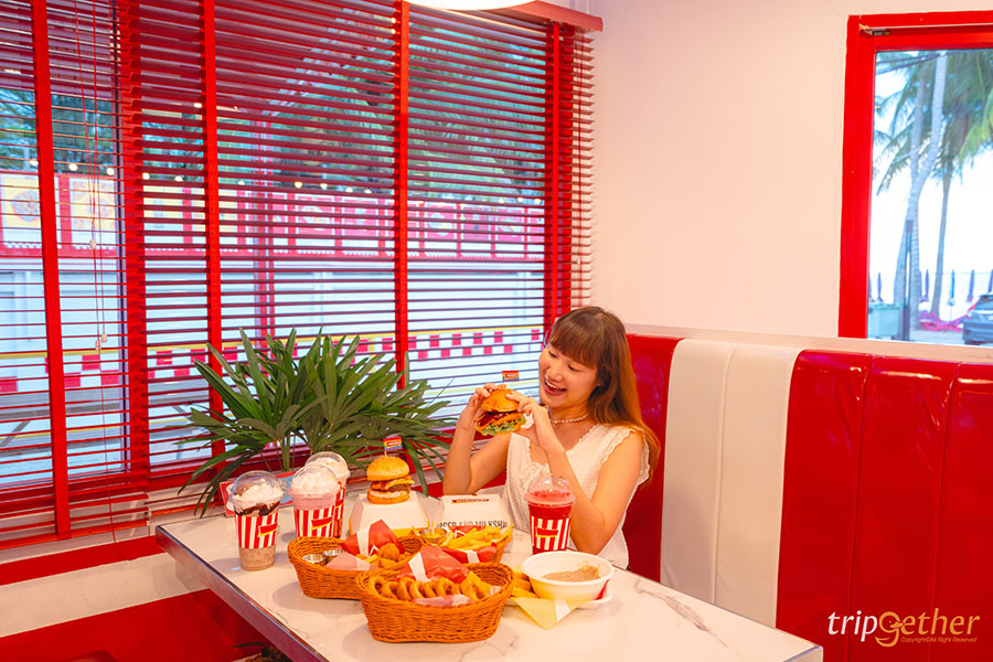 มุมถ่ายรูปยอดฮิตก็เริ่มตั้งแต่ทางเข้า ที่ดูยังไงก็เหมือนหลุดมาจากหนังฝรั่ง ตรงนี้มาแล้วต้องเช็คอิน! และยังมีมุมอื่นๆ อีกเพียบ ไม่ว่าจะเป็นโปสเตอร์บนกำแพง เคาน์เตอร์สั่งอาหาร บันไดสีแดงด้านหลัง หรือจะเป็นบรรยากาศในร้าน เรียกได้ว่าเอาใจสายคอนเทนต์ ถ่ายรูปมุมไหนก็ดูเท่ ดูชิค และที่สำคัญมาช่วงเวลาไหนก็สวยหมด อย่างถ้ามาตอนเช้าก็ได้แสงอ่อนๆ ฟุ้งๆ ถ้ามาตอนเย็นๆ จะได้แสงช่วง Golden Hour แต่ถ้าแนะนำให้มาตอนดึกจะได้แสงไฟที่ทางร้านเปิด อันนี้ฟีลเหมือนอยู่ต่างประเทศจริง