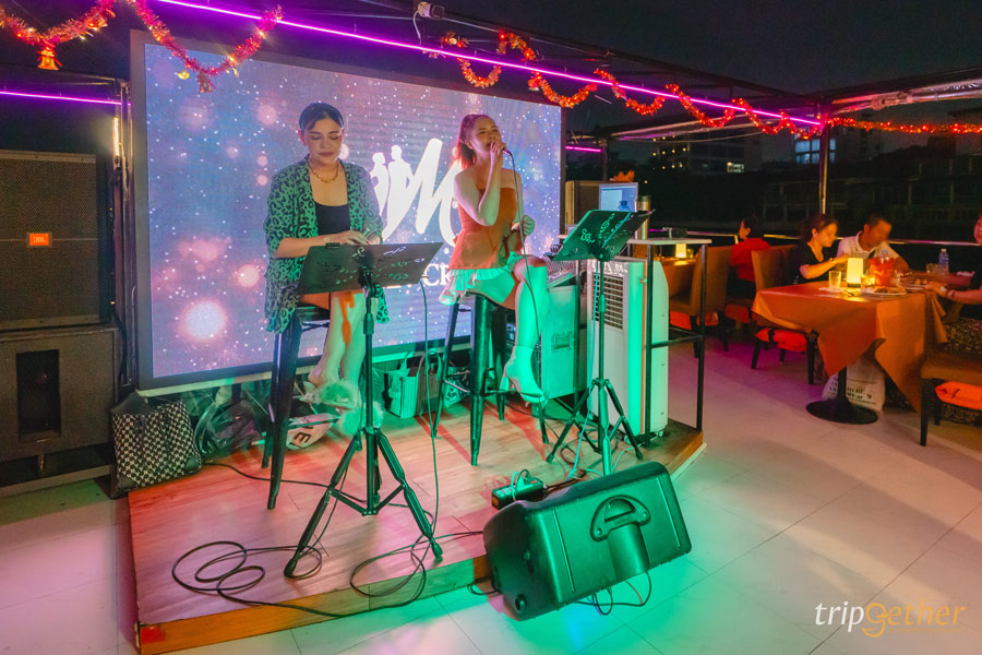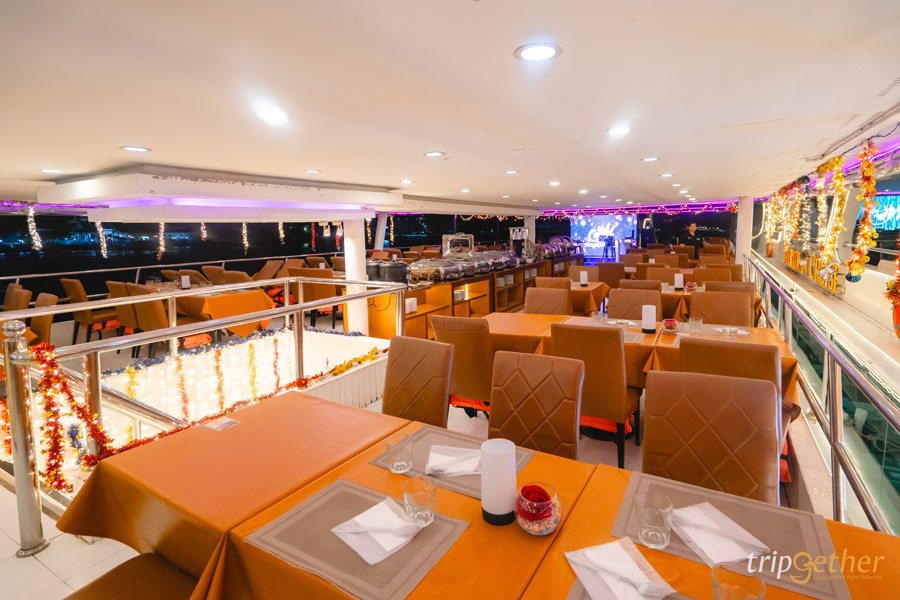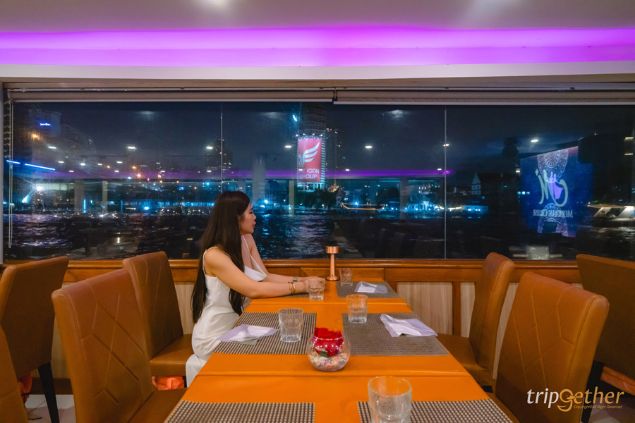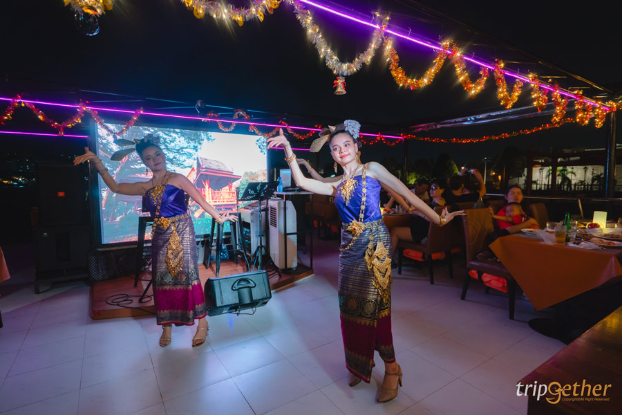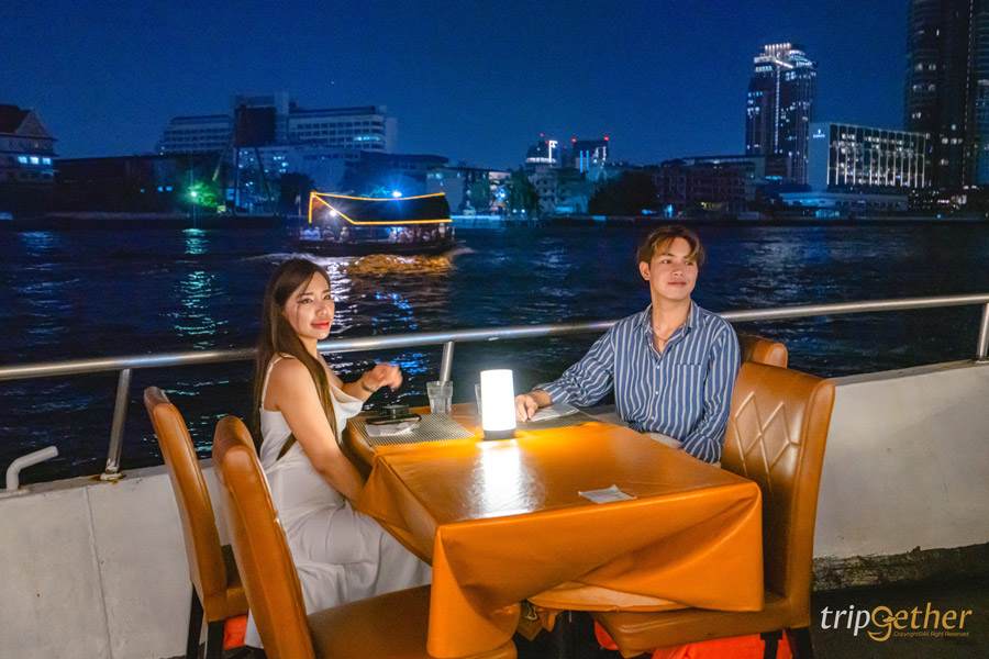 บรรยากาศบนเรือยังคึกคักและสนุกสนานด้วยนักร้องที่มาพร้อมกับบทเพลงที่ไพเราะและสนุกสนานที่ร้องเพลงให้ฟังกันแบบไม่มีกั๊ก 2 ชั่วโมงเต็ม ทั้งเพลงไทย เพลงสากล เพลงญี่ปุ่น เพลงจีน และเพลงแดนซ์สนุกๆ จนมีหลายๆ คน ลุกขึ้นมาเต้นกันหน้าเวทีกันเลย แถมบางช่วงยังมีการแสดงสวยๆ ให้ได้ชมกันแบบเพลินๆ อีกด้วย เป็นมื้ออาหารที่ครบทุกรสชาติความสุขอย่างแท้จริง