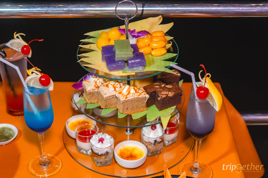 นอกจากเมนูอาหารจานหลักและของกินเล่นแล้ว ยังมีเมนูของหวานที่ยกมาแบบจัดเต็มเป็นชิ้นพอดีคำ มีทั้ง เมนูเบเกอรีอย่างเค้กหน้าต่างๆ ขนมไทยมงคล ไม่ว่าจะเป็น ทองหยอด เม็ดขุนน และขนมชั้น ส่วนเมนูจากฝั่งยุโรปก็มีพานาคอตต้า เครมบรูเล่ และบานอฟฟี่