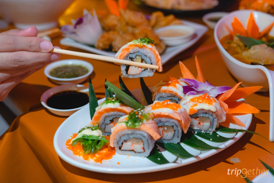 นอกจากนี้ยังมีเมนูอาหารให้เลือกกันอีกหลากหลาย ไม่ว่าจะเป็น ซูชิหน้าต่างๆ ทั้งโรล หน้าแซลมอน ไข่กุ้ง ยำสาหร่าย และยังมีส้มตำไทย ผัดไทยกุ้งสดที่รสชาติครบเครื่อง ก๋วยเตี๋ยวเรือเมอริเดียนที่ทำเสิร์ฟแบบจานต่อจาน ให้ได้ซดน้ำซุปกันแบบร้อนๆ