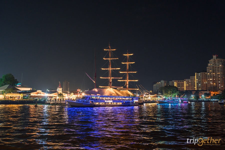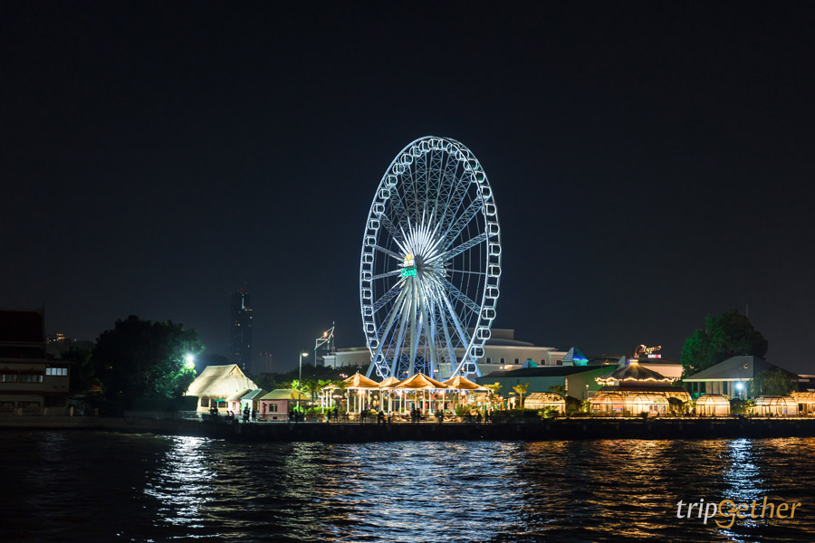 ก่อนที่เรือจะเทียบท่า จะล่องผ่านอีกหนึ่งจุดแลนด์มาร์กของกรุงเทพฯ นั่นก็คือ เอเชียทีค ภาพของชิงช้าขนาดใหญ่และแสงสีไฟหลากสีสันสะท้อนกับผืนน้ำมองแล้วสวยงามและเพลินตามากๆ แนะนำเลยว่าสายคอนเทนต์ไม่ควรพลาดมุมนี้นะ