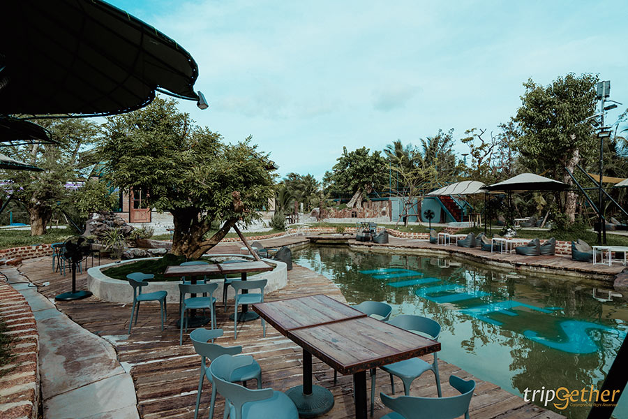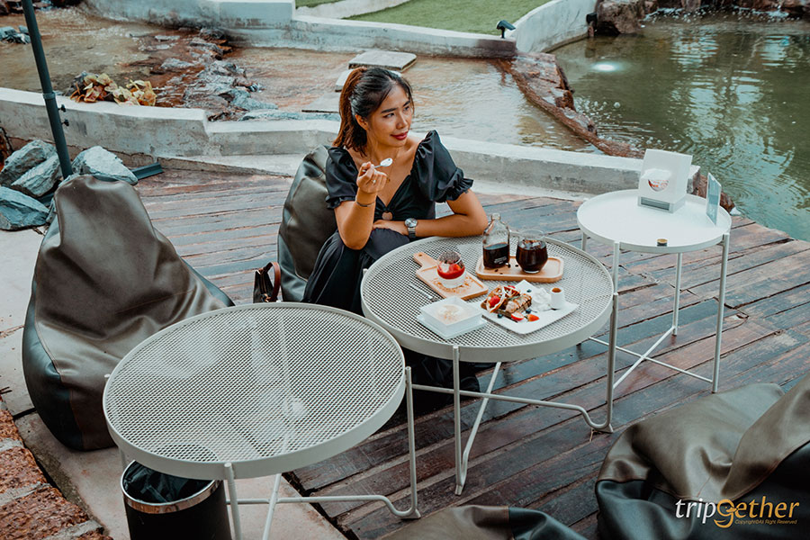 มาต่อกันกับโซนเอาท์ดอร์ของ Nives Cafe and Bar โดยโซนไฮไลท์ของคาเฟ่นครปฐมแห่งนี้ ที่นั่งที่มีทั้งแบบชุดโต๊ะเก้าอี้สบายๆ และบีนแบคนุ่มสุดชิลล์ จะวางกระจายกันอยู่ทั่วทั้งพื้นที่รอบสระน้ำ บอกเลยว่าที่นั่งโซนนี้สบายสุดๆ เพราะจะได้รับฟีลลิ่งการพักผ่อนท่ามกลางธรรมชาติริมน้ำ และสามารถนั่งมองฟ้าสีพาสเทลในช่วงเย็นได้แบบ HD อีกด้วย ซึ่งโซนนี้สามารถมานั่งสวยๆ ถ่ายรูปเช็คอินได้ตลอดทั้งวัน แต่ถ้าเป็นหลัง 17.00 น. อากาศก็จะไม่ร้อนและสามารถนั่งชิลล์ๆ ได้
