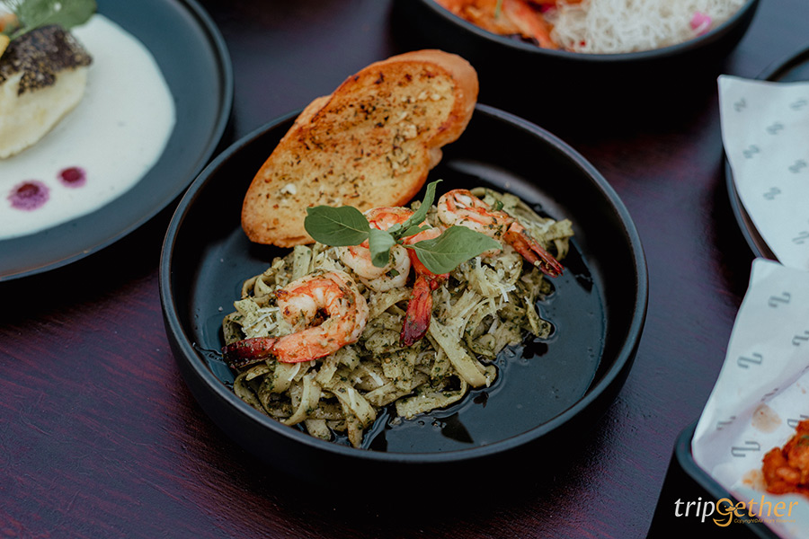 เฟตตูชินีเพสโต้กุ้ง เมนูเส้นเก่าแก่ของโรมันที่เต็มไปด้วยความอร่อยแสนละมุนมาพร้อมกับกุ้งเนื้อแน่น และขนมปังกระเทียมหอมๆ ราคาอยู่ที่ 269 บาท