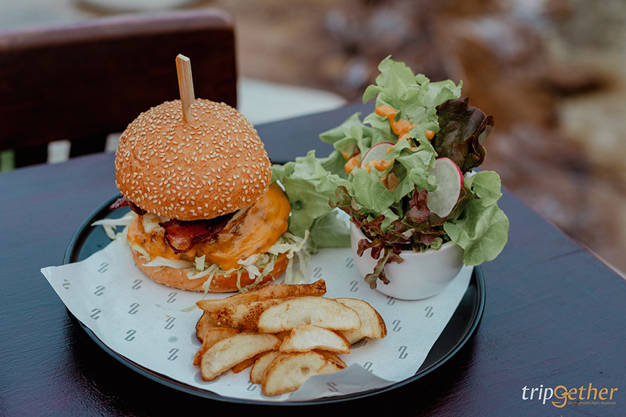 เบอร์เกอร์เนื้อวากิว ฉ่ำๆ แป้งขนมปังที่เพิ่มความหอมด้วยงา เสิร์ฟพร้อมสลัดผักและมันฝรั่งทอด ราคา 320 บาท แอบกระซิบว่าเมนูนี้สามารถเพิ่ม ไข่ ชีส เบคอน ได้อีกด้วย