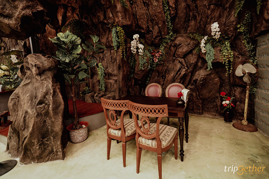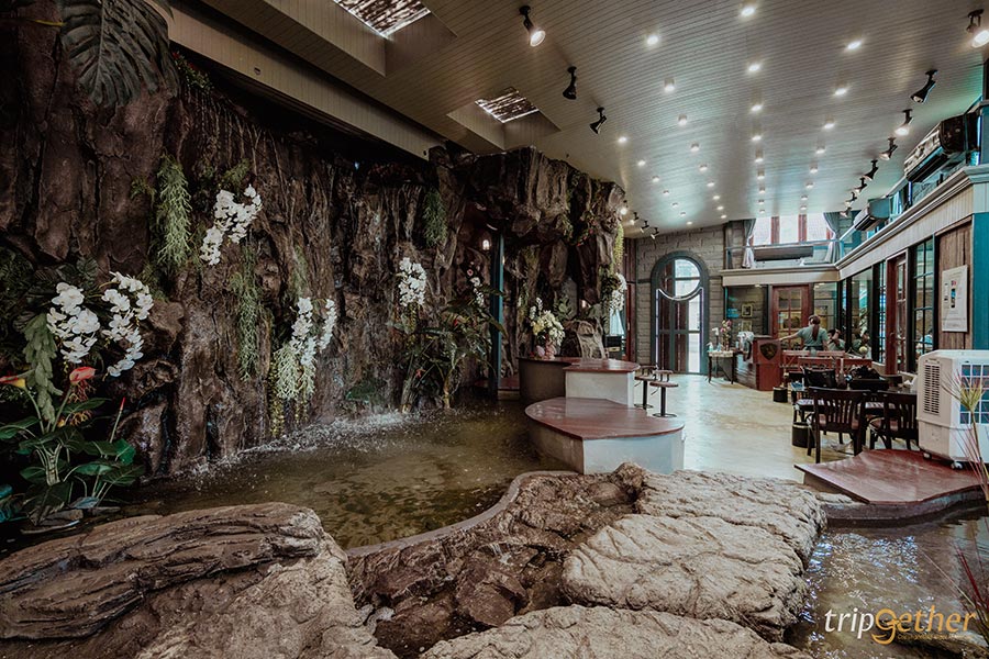 ผ่านสะพานยกเข้ามาแล้ว ก็จะพบกับบรรยากาศที่เรียกได้ว่าแม้จะอยู่ในปราสาทแต่ก็ร่มรื่นเป็นที่สุด เพราะภายในปราสาทแห่งนี้ได้จำลองผาน้ำตกขนาดใหญ่ที่มีน้ำไหลผ่านซอกหินเป็นเสียงคลอที่ช่วยให้ความผ่อนคลายอยู่ตลอดเวลา มุมที่นั่งต่างก็กระจายกันอยู่ทั่วทั้งโถงของปราสาท โดยเฟอร์นิเจอร์ต่างๆ ก็จะเน้นเฟอร์นิเจอร์ไม้ที่ให้กลิ่นอายความเป็นยุโรปได้อย่างดี นอกจากนี้มุมที่นั่งไฮไลท์เลยก็คือบาร์ชิลล์ๆ ริมน้ำตก ให้ได้นั่งสบายๆ รับไอเย็นจากละอองน้ำ ได้ฟีลธรรมชาติมากๆ