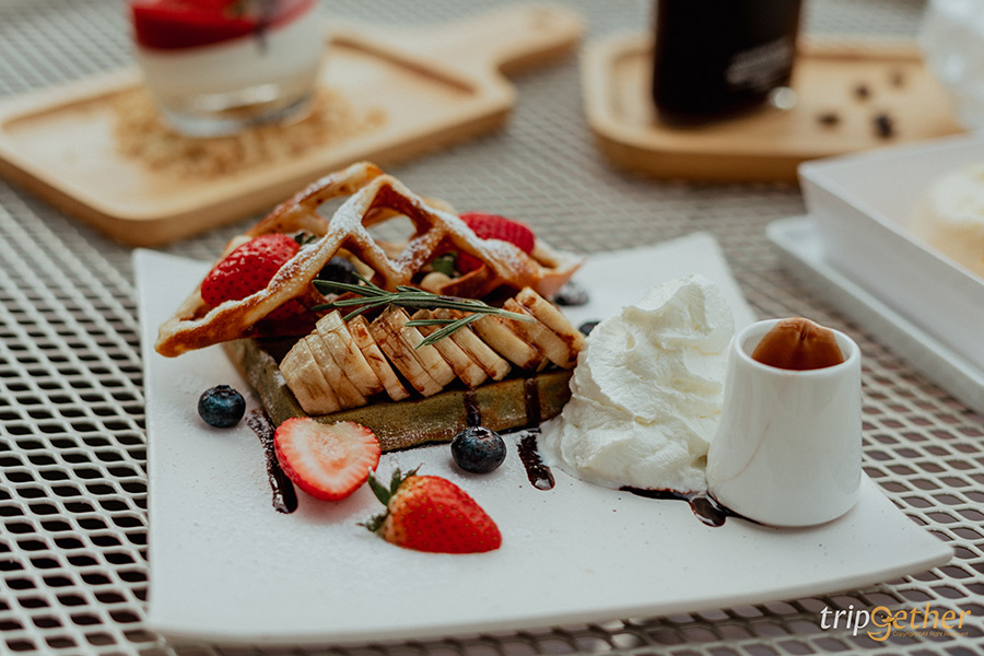 เริ่มต้นความฉ่ำกันด้วย เมนูมัทฉะเบอร์รี่วาฟเฟิล แป้งวาฟเฟิลหอมกลิ่นมัทฉะ ตัดด้วยความเปรี้ยวหวานของเหล่าเบอร์รี่ ราคาอยู่ที่ 139 บาท