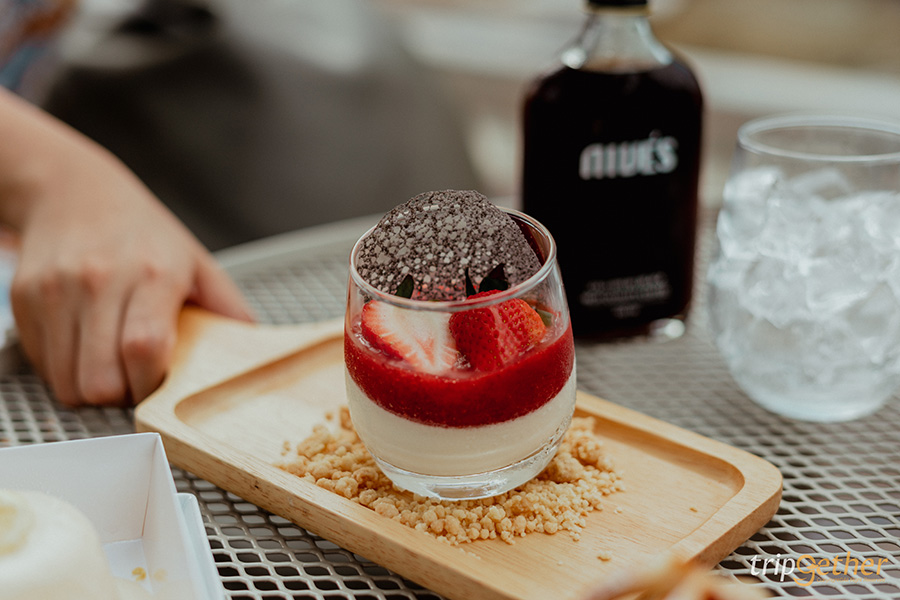 มาต่อกันกับเมนูสุดนุ่มพร้อมกลิ่นวานิลลาหอมๆ อย่าง พานาคอตต้าสตรอว์เบอร์รี่ ท็อปด้วยสตรอว์เบอร์รี่สดๆ เต็มคำ ราคา 119 บาท