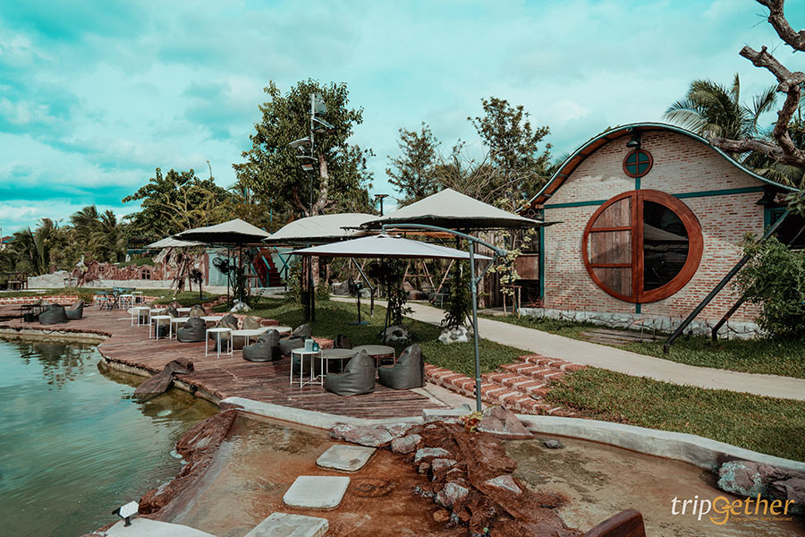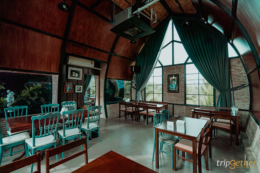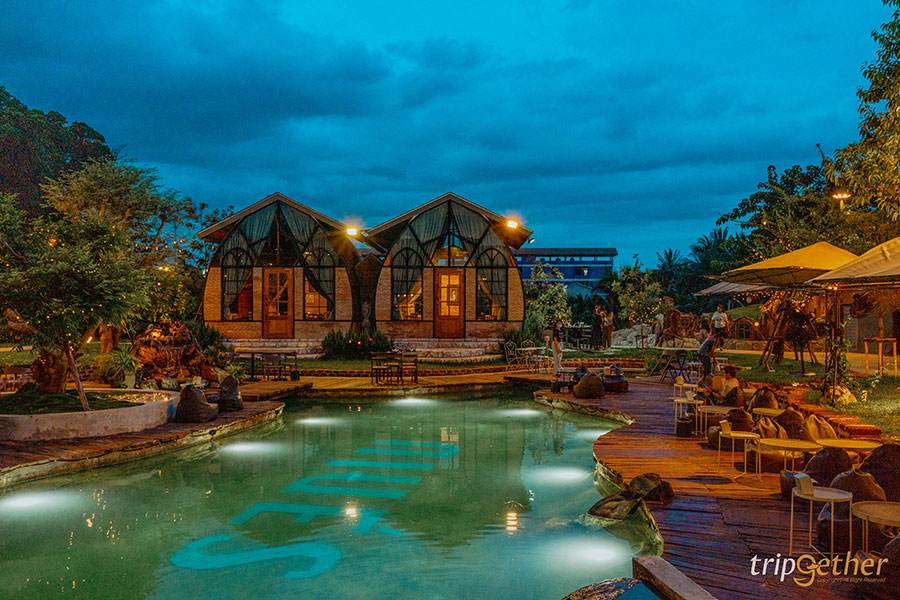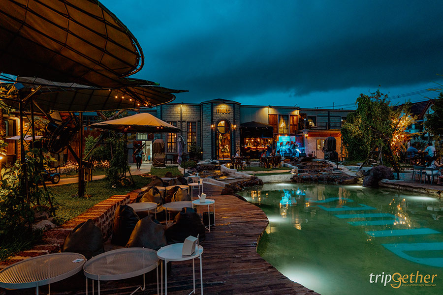 เมื่อฟ้าเริ่มมืดลงทั่วทั้งบริเวณของร้านที่เป็นโซนเอาท์ดอร์ก็จะสว่างไสวไปด้วยไฟที่ประดับตกแต่งไว้อย่างอลังการ โดยเฉพาะในส่วนของไฟใต้น้ำที่ส่องสว่างส่งให้ชื่อของร้านที่อยู่ใต้น้ำเด่นชัดขึ้นมา กลางวันกับกลางคืนมู้ดในร้านก็จะแตกต่างกันออกไป ถือเป็นความแปลกใหม่ของการพักผ่อนสมกับการเป็นแลนด์มาร์กแห่งใหม่ของนครปฐมเป็นอย่างมาก