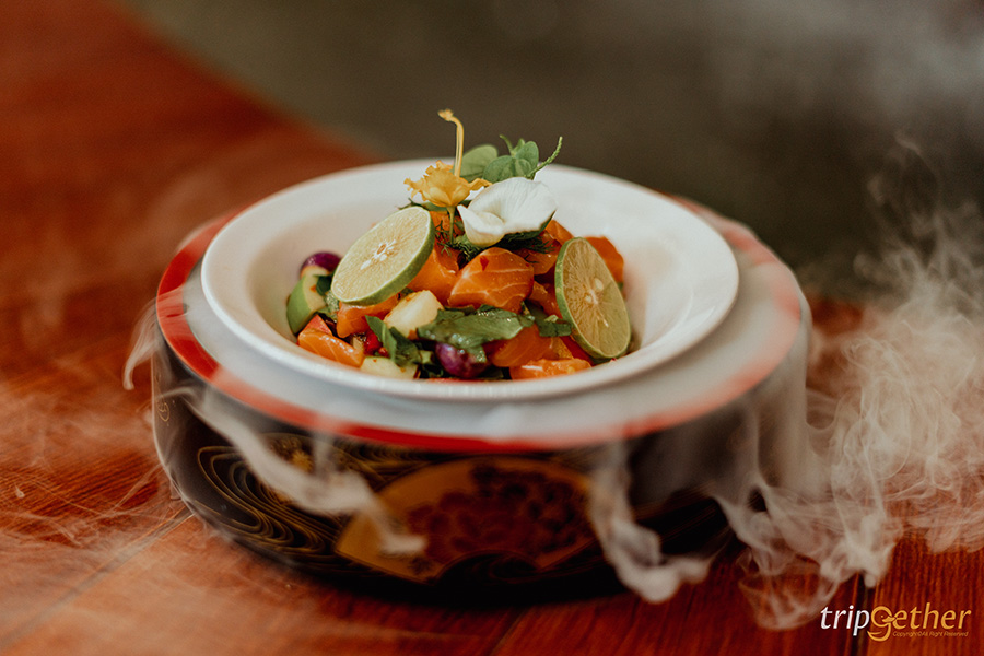 เปิดความอร่อยกันที่เมนูแรก นั่นก็คือ ยำแซลมอนนัว ที่เสิร์ฟมาพร้อมน้ำแข็งแห้ง ให้ฟีลยำจานนี้กำลังล่องลอยอยู่ในอากาศ ส่วนรสชาติก็บอกเลยว่าจัดจ้านถึงเครื่องเข้ากันกับเนื้อแซลมอนสีส้มลายสวยฉ่ำๆ ได้เป็นอย่างดี จานนี้ราคาอยู่ที่ 259 บาทเท่านั้น