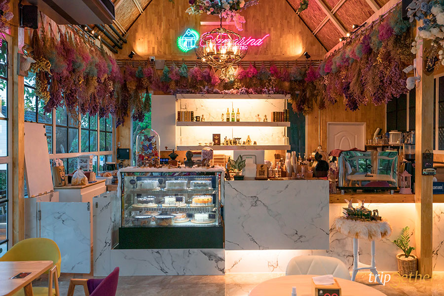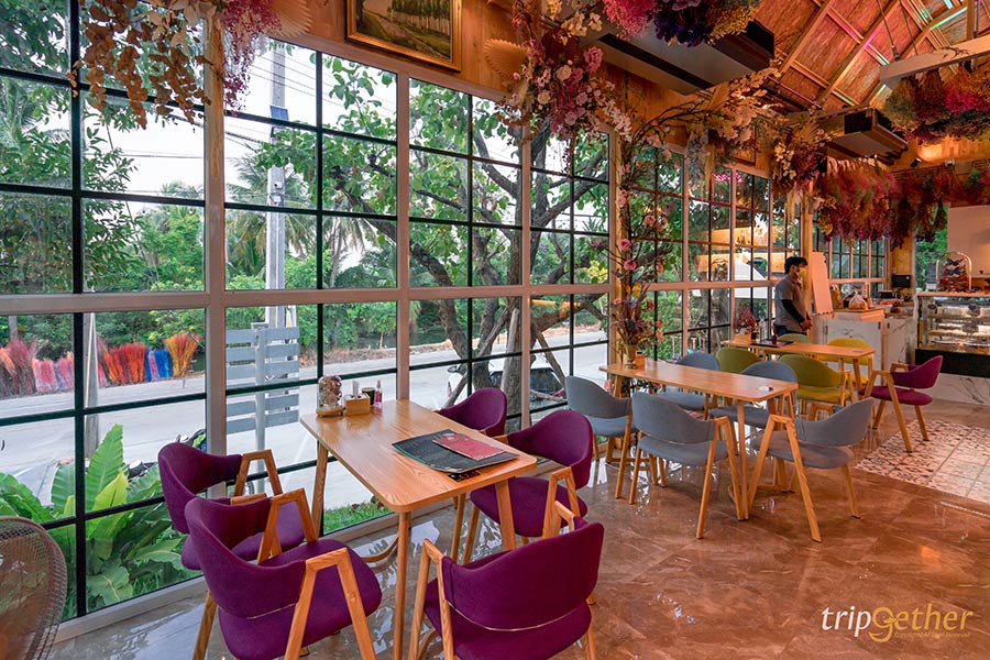 แล้วก็ยังมีที่นั่งอินดอร์ด้านหน้า การตกแต่งภายในเหมือนโลกเจ้าหญิง เต็มไปด้วยดอกไม้แห้งสีสันต่างๆ จำนวนมาก ร้านดูโล่งโปร่งด้วยหน้าต่างที่อยู่รอบร้าน ทำให้เห็นวิวจากภายนอกได้แบบเต็มๆ ตา นอกจากนี้ข้างในยังมีจัดซุ้มดอกไม้สวยๆ ให้ได้ถ่ายรูปกันหรือจะเป็นการตกแต่งและแสงไฟในร้านที่ถ่ายรูปออกมาก็สวย สำหรับโซนอินดอร์จะมีด้านหน้าตรงทางเข้าร้าน 7 โต๊ะและมีด้านหลังร้าน 8 โต๊ะ