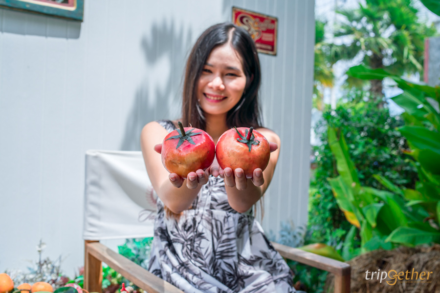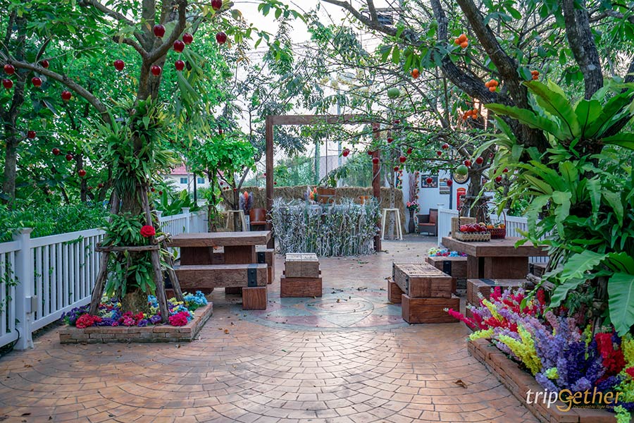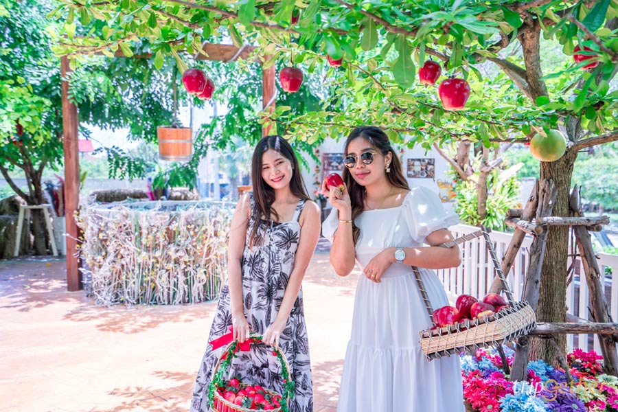 ด้านหน้าร้านมีมุมสวนแอปเปิ้ลจำลอง ซ้อมเป็นสโนว์ไวท์ได้เลย