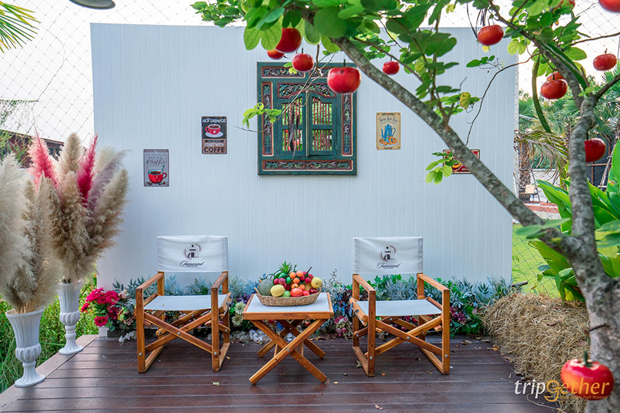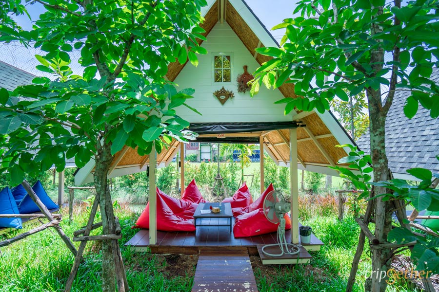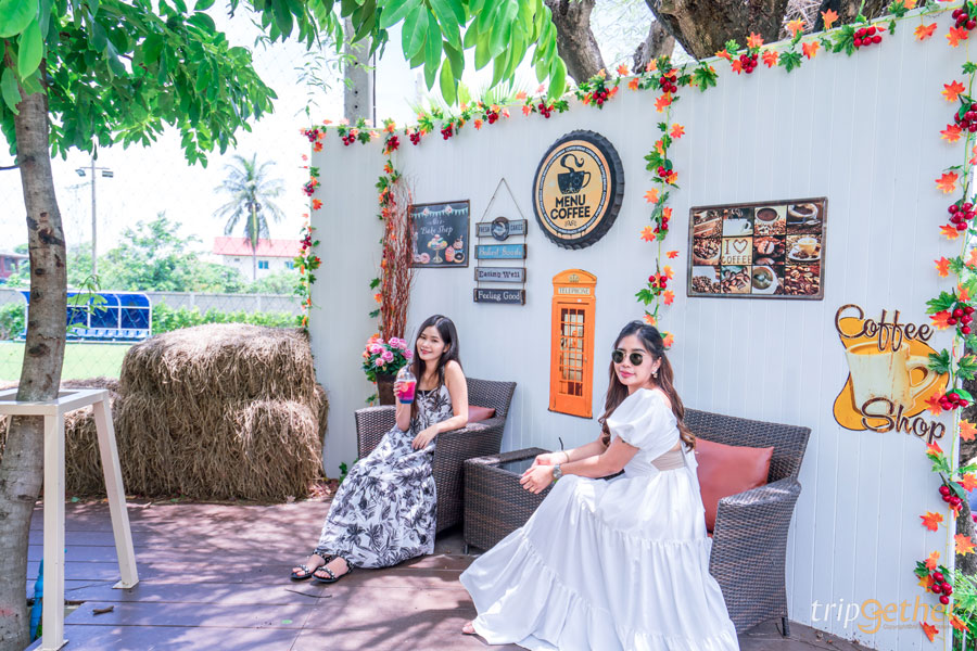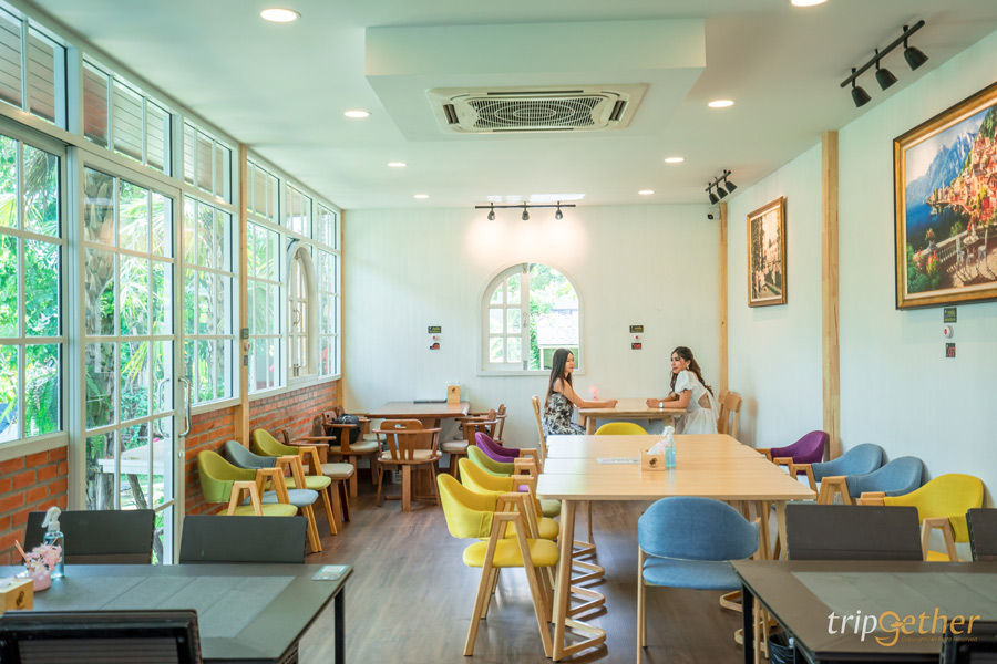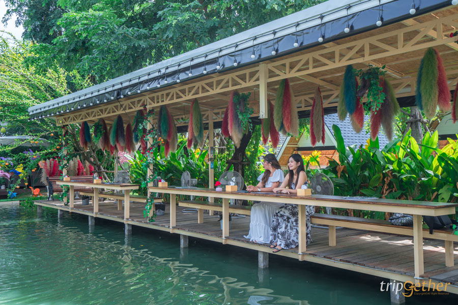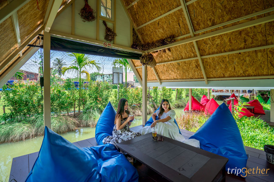 ภายในร้านกว้างขวางด้วยพื้นที่กว่า 3 ไร่เศษ ส่วนใหญ่เป็นที่นั่งแบบเอาท์ดอร์ริมน้ำที่ฟีลดีมากๆ เป็นที่นั่งโอเพ่นแอร์เปิดกว้างนั่งรับลมธรรมชาติพัดโกรกสบายๆ ที่สำคัญได้เห็นน้องเป็ดและฝูงปลาว่ายเล่น บรรยากาศดีสุดๆ อีกทั้งยังมีที่นั่งให้เลือกหลายแบบ มีให้เลือกกว่า 30 โต๊ะ ไม่ว่าจะเป็นที่นั่งแบบบีนแบค นั่งเก้าอี้ หรือนั่งห้อยขา ล้วนแต่ชิลล์ทั้งนั้น และพิเศษสุดๆ สำหรับที่นั่งโซนเอาท์ดอร์สามารถพาสัตว์เลี้ยงตัวเล็กเข้ามาในร้านได้ด้วย