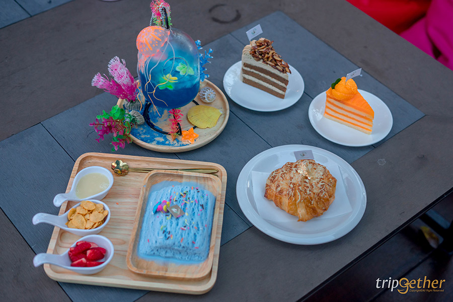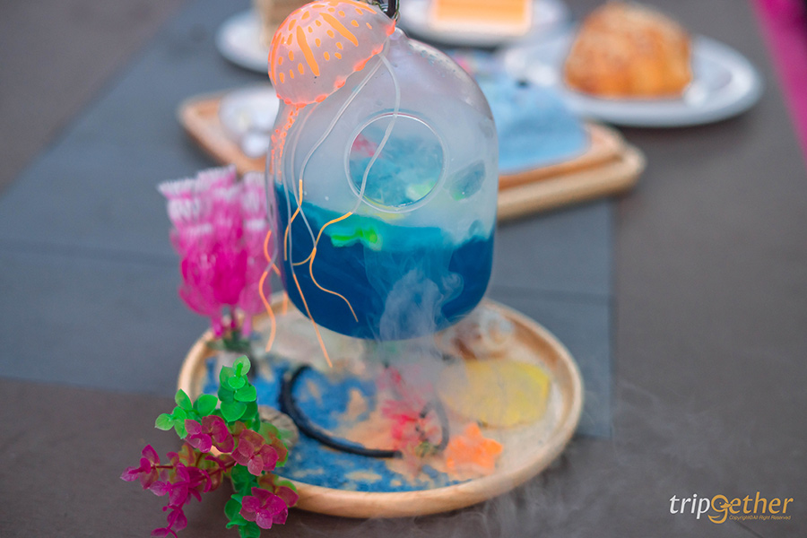 เมนูไฮไลท์ที่เสิร์ฟมาอย่างอลังการ สายคอนเทนต์ต้องกดถ่ายรูปรัวๆ กับเมนู Deep Blue See น้ำบลูฮาวายที่ถูกจำลองออกมาเป็นบรรยากาศของท้องทะเล ตกแต่งด้วยปะการัง สาหร่าย ปลาดาว แมงกะพรุน เสิร์ฟมาพร้อมควัน ทำให้ดูลึกลับเหมือนใต้ทะเลลึกสมกับชื่อเมนูมาก ส่วนราคาก็น่ารักเพียง 129 บาทเท่านั้น
