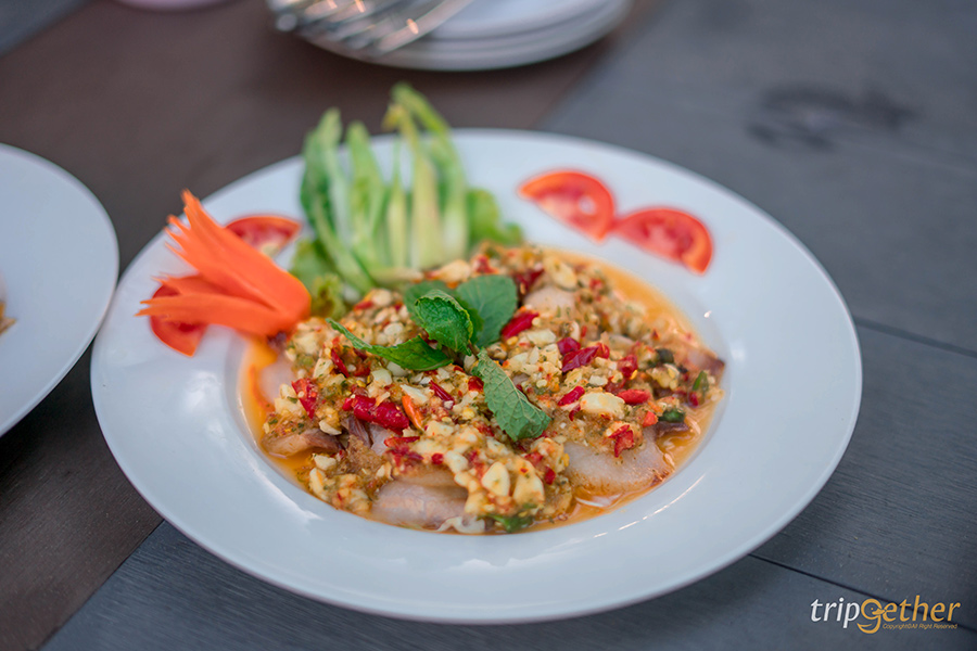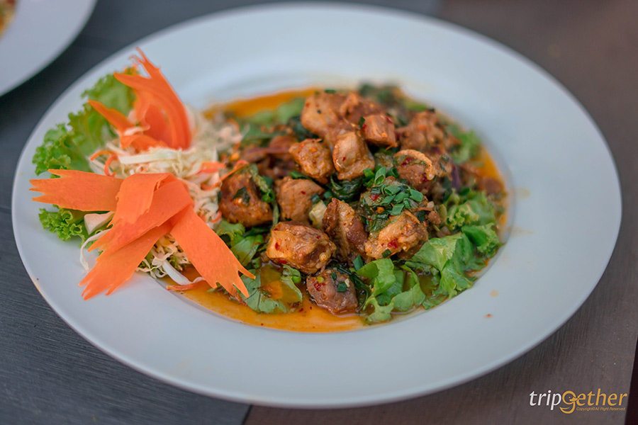 อีกเมนูกินง่ายๆ อย่างหมูคำหวานราคา 150 บาท หมูถูกย่างมาหอมๆ ชิ้นพอดีคำ เนื้อหมูนุ่มมีมันแทรกฉ่ำๆ ราดด้วยน้ำยำพริกกระเทียม รสแซ่บ เปรี้ยว หวานลงตัว ใครมาต้องสั่งให้ได้