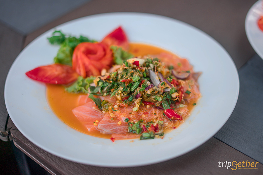 ต่อมาเอาใจสายปลาส้มกับยำแซลมอนไทย เนื้อแซลมอนสดสไลด์มาชิ้นใหญ่ๆ กินได้แบบเต็มคำ หอมกลิ่นเครื่องยำและแซลมอน กินแซลมอนไปซดน้ำยำไปด้วย ฟินสุดๆ แซลมอนจานใหญ่ๆ แบบนี้ราคา 250 บาท
