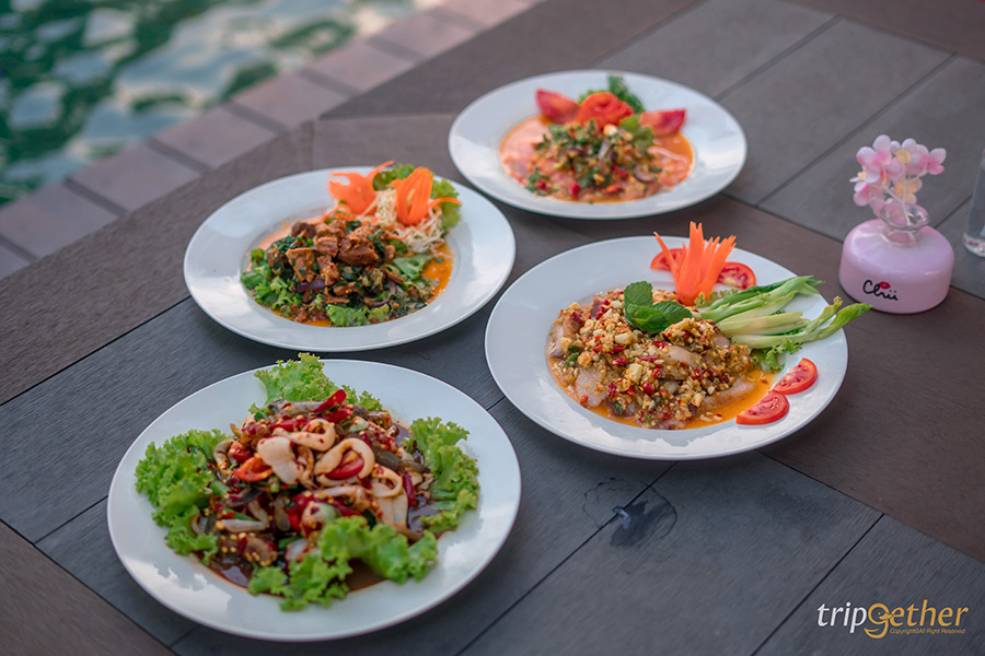 ถ้าใครเลือกได้แล้วว่าจะนั่งตรงไหนก็ได้เวลาสั่งของกินกัน สำหรับเมนูที่เสิร์ฟเน้นอาหารกินง่ายๆ มีให้เลือกหลากหลาย แบบจัดเต็มทั้งอาหารคาว ขนมหวาน และเครื่องดื่ม เริ่มจากอาหารคาวเน้นเสิร์ฟเป็นเมนูยำรสแซ่บ บอกเลยว่าคาเฟ่หวานๆ แต่รสชาติยำถึงเครื่องมาก ครบทั้งเผ็ด เปรี้ยว หวาน แต่ละจานเสิร์ฟมาแบบจัดเต็มและจานใหญ่ทั้งนั้น