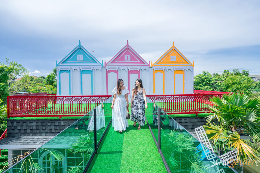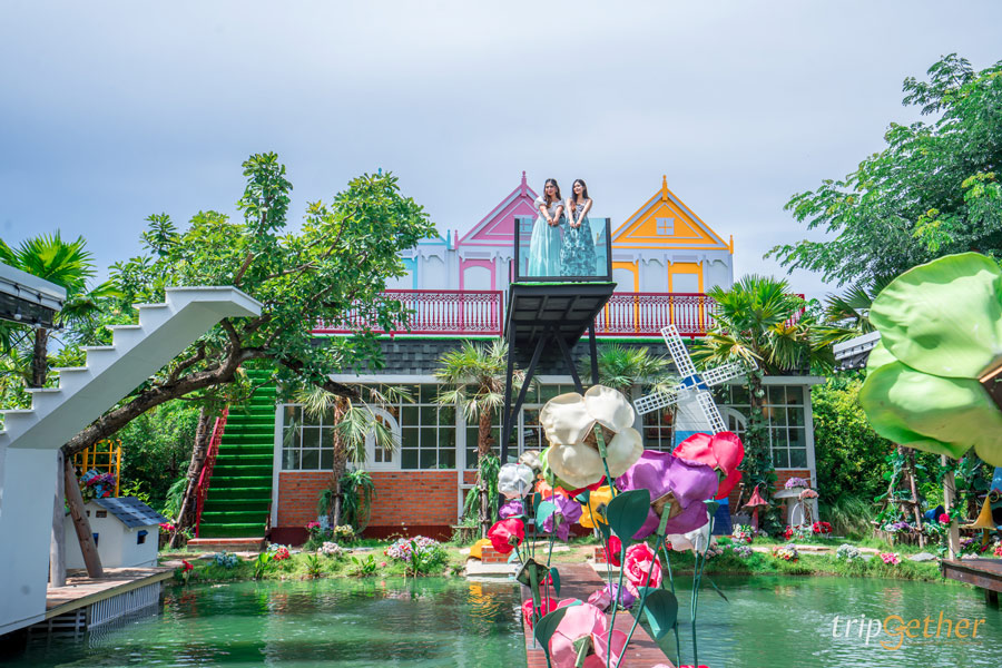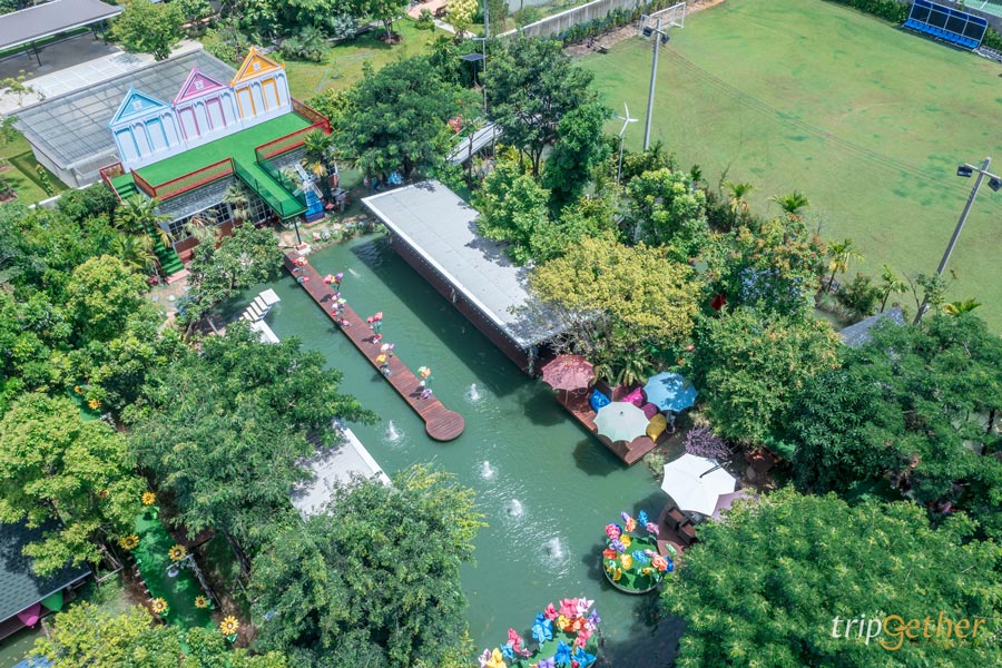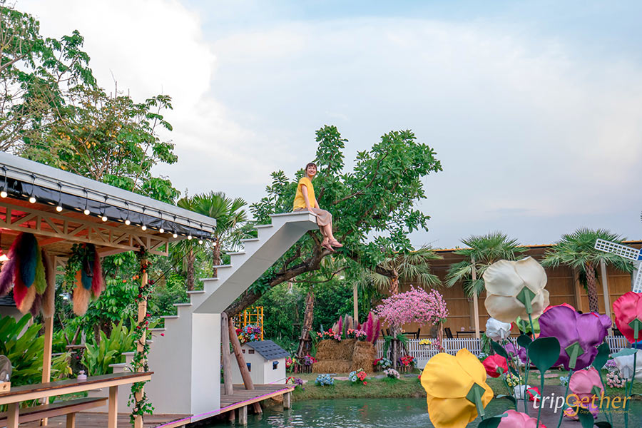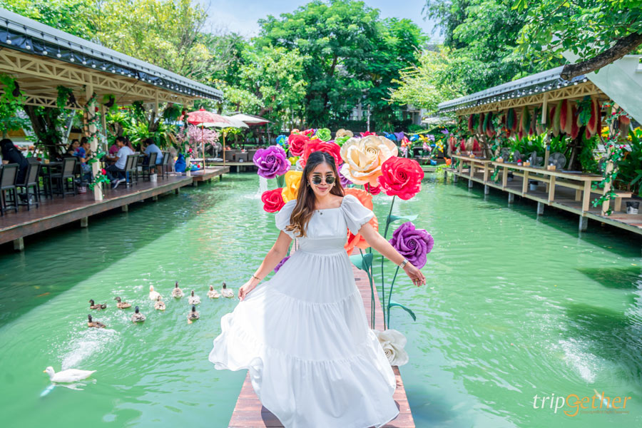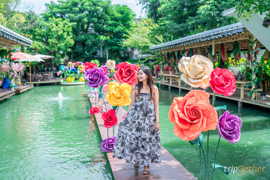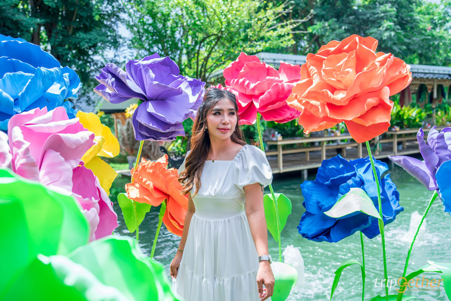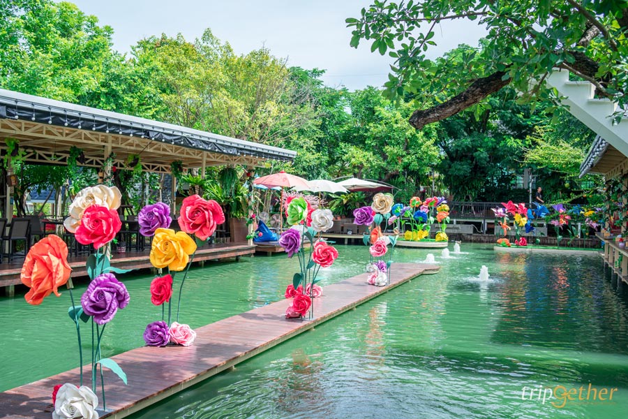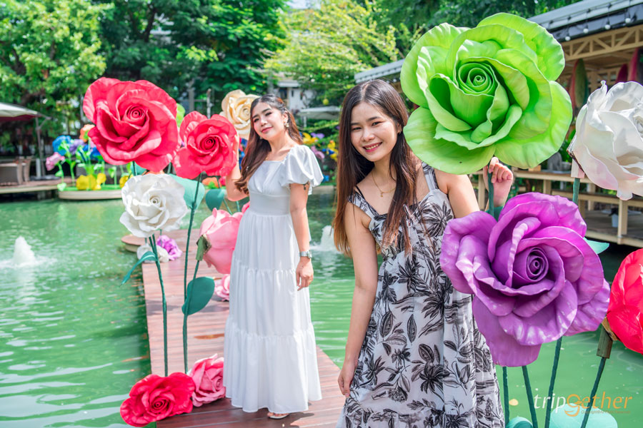 มุมไฮไลท์ที่ห้ามพลาด สะพานไม้ทอดยาวไปกลางสระน้ำ ตกแต่งด้วยดอกกุหลาบยักษ์สีสันสดใส