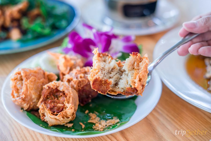 มาต่อกันที่เมนูของทอดกันบ้าง ฮ่อยจ๊อปูทะลัก เนื้อปูแน่นๆ ทอดกรอบเสิร์ฟพร้อมน้ำจิ้มบ๊วย ตกแต่งจานด้วยดอกกล้วยไม้อย่างสวยงาม ราคา 270 บาท