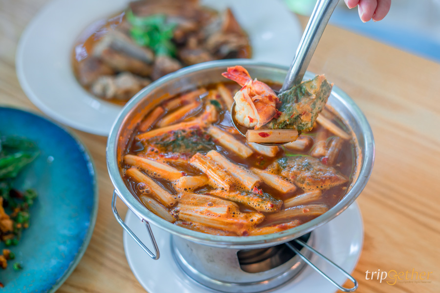 มาต่อกับเมนูต้มกันบ้างอย่าง แกงส้มชะอมกุ้งไหลบัว กุ้งตัวโตเสิร์ฟมาในหม้อไฟร้อนๆ กินพร้อมกับไข่ชะอมและไหลบัว รสชาติเปรี้ยวจัดจ้านถึงเครื่องแกงมาก หม้อนี้ราคาเพียง 200 บาทเท่านั้น