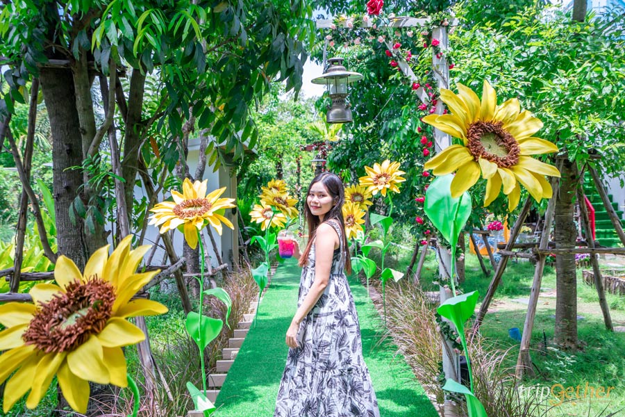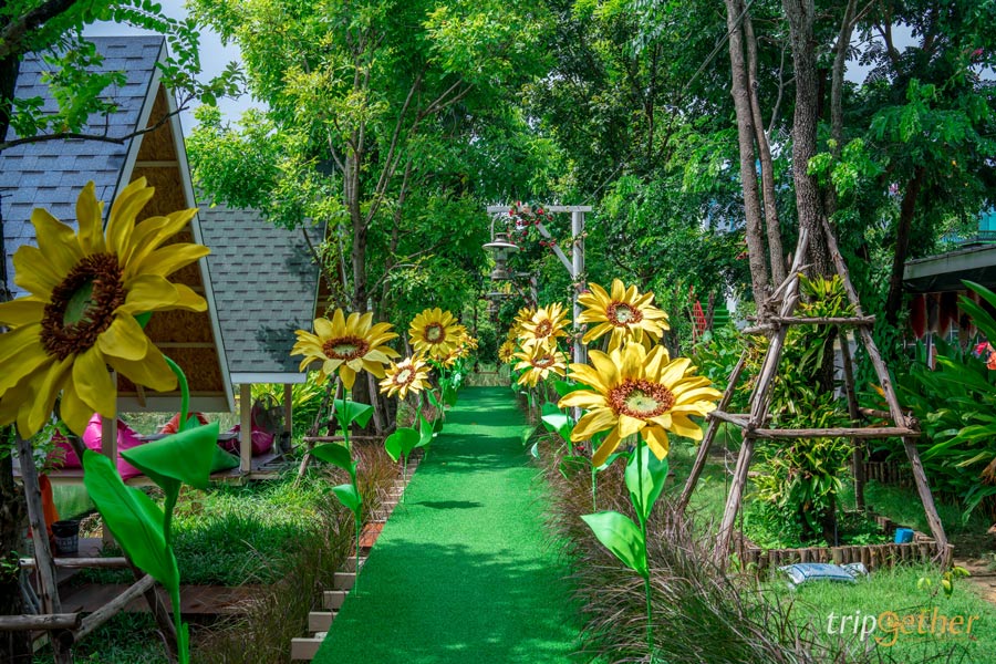 ทางเดินเข้าไปข้างในร้าน ตกแต่งด้วยดอกทานตะวันสีเหลืองสดใสตลอดทั้งทาง