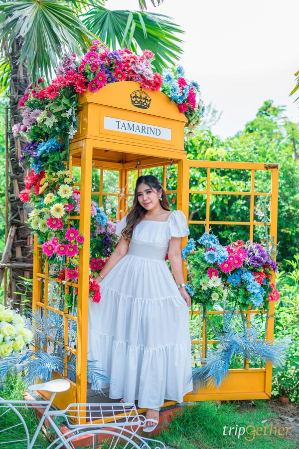 มุมตู้โทรศัพท์สีเหลืองตกแต่งด้วยดอกไม้หลากสีนานาพันธุ์ สวยมากๆ