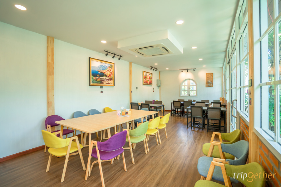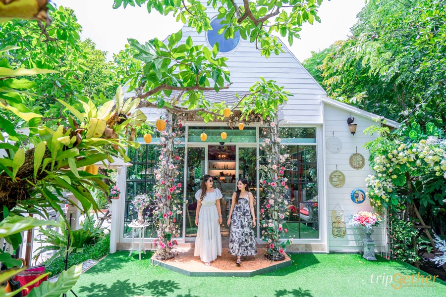 เพียงเดินเข้ามาในร้านก็เหมือนหลุดเข้ามาอยู่ในโลกเทพนิยาย การตกแต่งภายในเต็มไปด้วยสีสันสดใสของหมู่มวลดอกไม้ ไม่ว่าจะเป็นดอกเลาหลากสีสัน ดอกไม้แห้ง ดอกกุหลาบดอกโตๆ บวกกับของเฟอร์นิเจอร์และของตกแต่งต่างๆ ทำมาจากไม้ ช่วยให้ร้านดูกลมกลืนกับบรรยากาศโดยรอบ อีกทั้งร้านก็ชิลล์มากๆ อยู่ท่ามกลางความร่มรื่นของต้นไม้และความสดชื่นจากสระน้ำสีฟ้ามรกต เพิ่มความมีชีวิตชีวาด้วยฝูงเป็ดและฝูงปลาคาร์ปที่แหวกว่ายโชว์ตัวอยู่กลางสระน้ำ บอกเลยว่าบรรยากาศดีมากๆ เหมาะกับการมานั่งพักผ่อนและหาอะไรกินสบายๆ