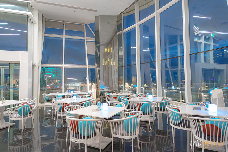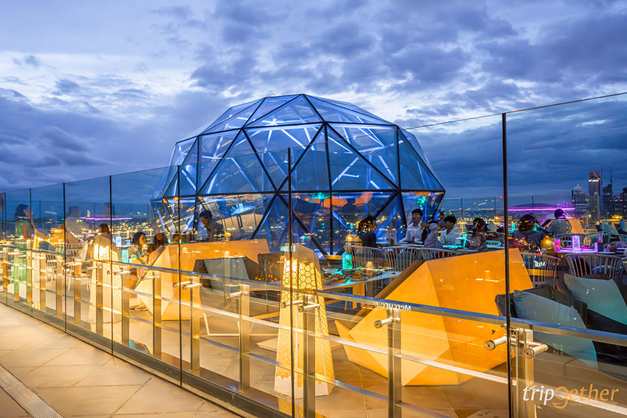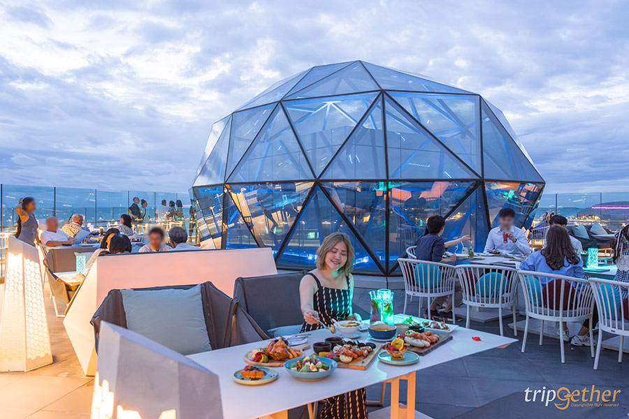 ความโดดเด่นของโซนที่นั่งแบบเอาท์ดอร์คือโดมกระจกใสที่มีการออกแบบล้ำสมัยตั้งอยู่ตรงกลางของลานที่นั่ง ซึ่งในช่วงกลางคืนจะมีไฟหลากสีส่องสว่างออกมาจากในโดมกระจก บอกเลยว่าตัดกับสีท้องฟ้ายามเย็นงดงามอลังการมาก