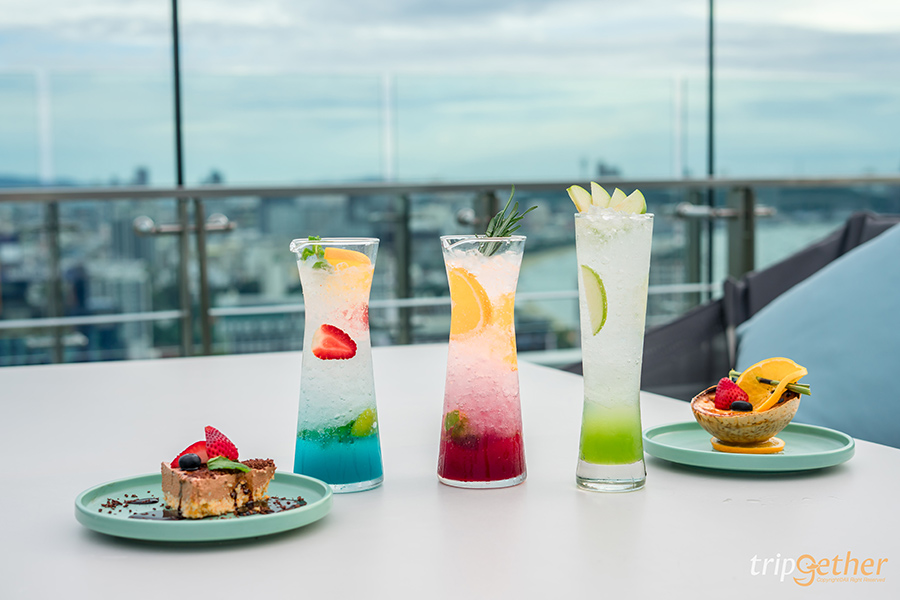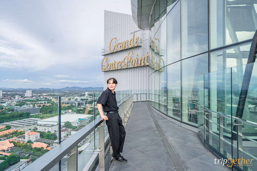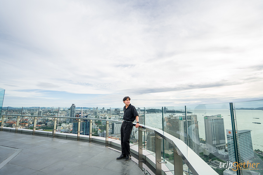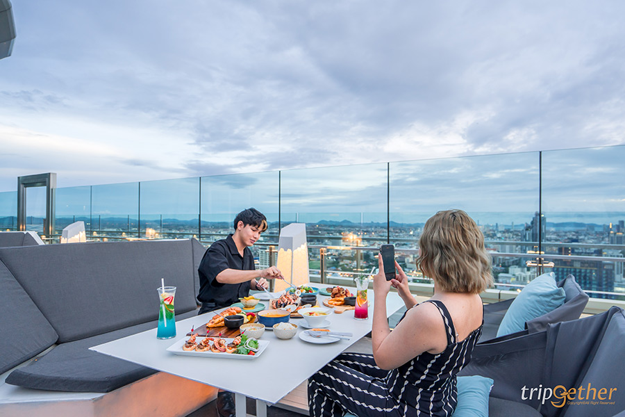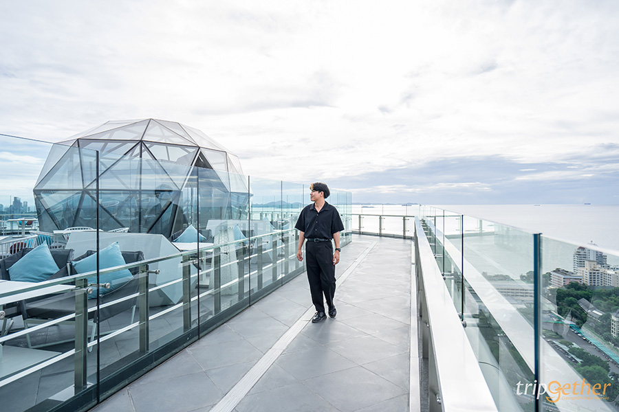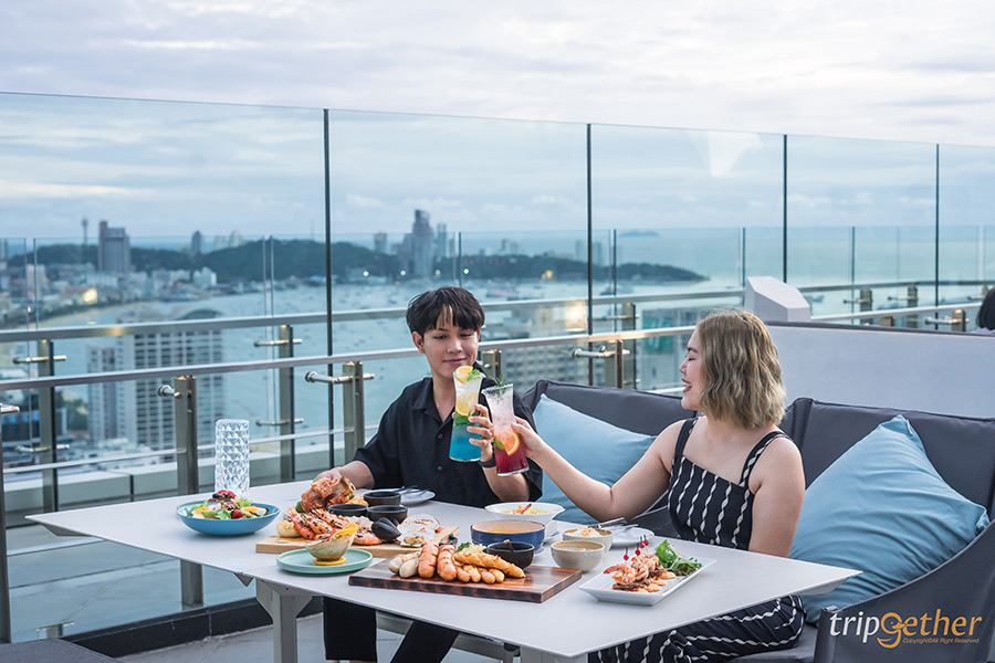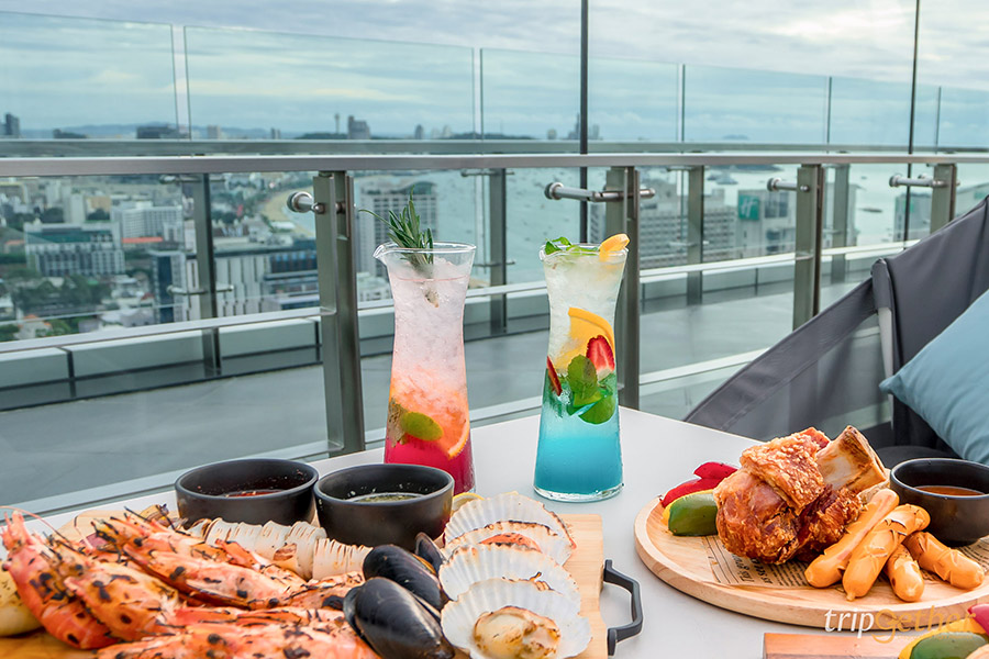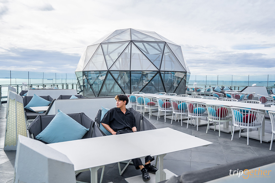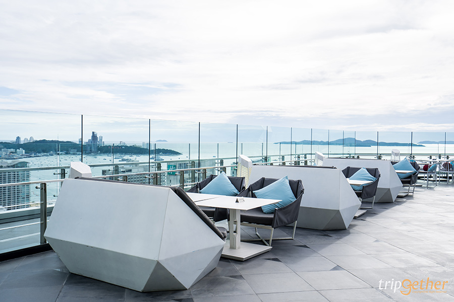 แถมรอบๆ ของลานที่นั่งแบบเอาท์ดอร์ยังมีส่วนของระเบียงให้ได้เดินออกไปรับลมเย็นๆ พร้อมกับชมวิวเมืองพัทยาแบบเต็มๆ ทั้งโซนตัวเมือง ชายหาดพัทยาและทะเลอ่าวไทยที่เห็นเกาะล้าน หรือสายคอนเทนต์คนไหนอยากได้รูปสวยๆ อัปลงโซเชียลก็สามารถมายืนโพสท่าเก๋ๆ พร้อมกับวิวพระอาทิตย์ตกได้เลย