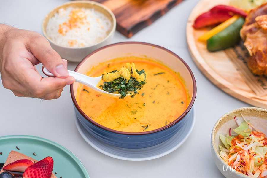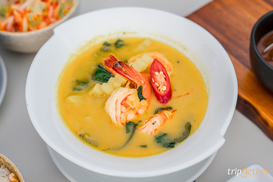 ดูเมนูอาหารนานาชาติกันไปแล้ว มาต่อกันกับอาหารไทยรสชาติต้นตำรับอย่างแกงคั่วปู ที่เข้มข้นครบเครื่องแบบแกงคั่ว พร้อมด้วยเนื้อปูฉีก และเพิ่มความหอมด้วยใบชะพลูเสิร์ฟมาพร้อมกับเส้นหมี่ที่โรยกระเทียมเจียวและยำมะม่วงสูตรเด็ด ราคาอยู่ที่ 280 บาท