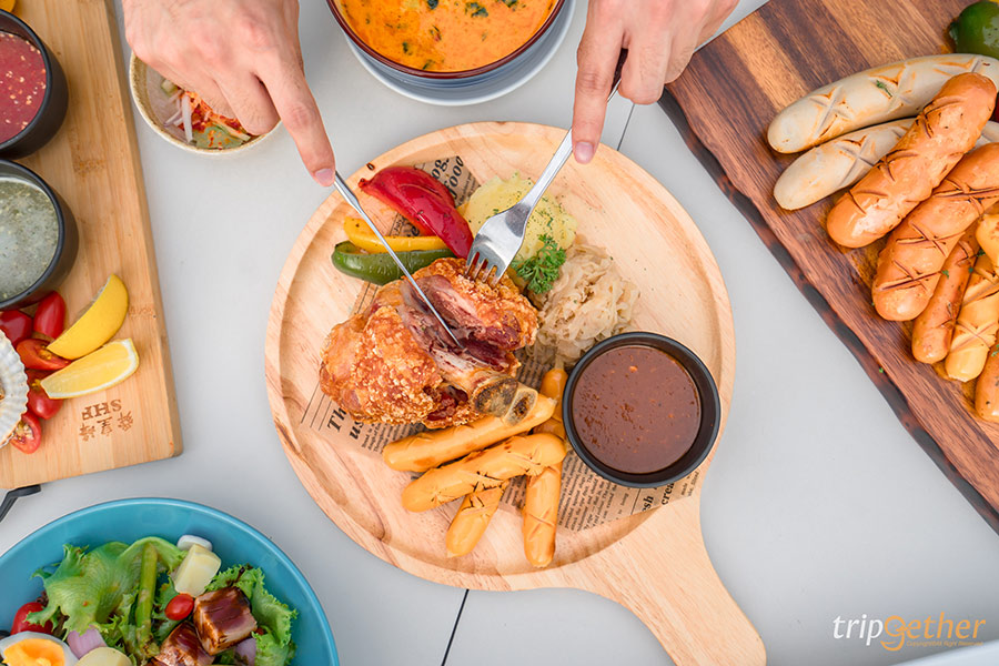 มาเริ่มกันที่เมนูแรกของชุดโปรโมชั่น German Pork Knuckle ขาหมูเยอรมันที่อบและทอดมาอย่างพิถีพิถัน ทำให้เวลากินจะได้ความรู้สึกกรอบนอกนุ่มใน และชุ่มฉ่ำมาก ยิ่งได้กินกับมัสตาร์ดเกรวี่ซอสของทางร้านอร่อยจนบรรยายไม่ถูก แถมยังมีไส้กรอก และกะหล่ำปลีดองรสชาติเปรี้ยวลงตัวตัดความเลี่ยนได้เป็นอย่างดี ราคาเริ่มต้นที่ 850 บาท