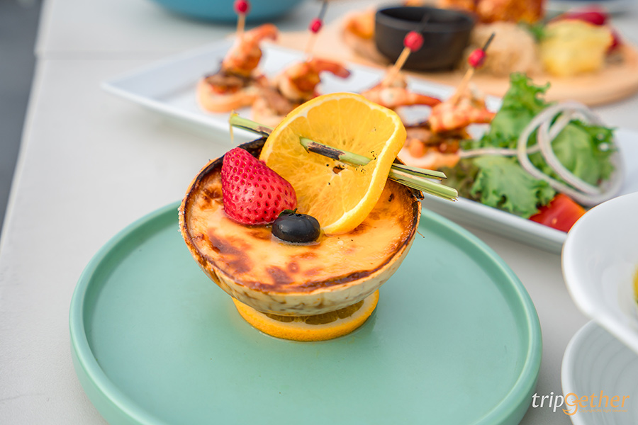 นอกจากนี้ยังมีเมนูของหวานและเครื่องดื่มให้เลือกอีกด้วย เริ่มกันที่เมนู Creme brulee เนื้อสัมผัสเนียนนุ่มคล้ายคัสตาร์ด ด้านบนเป็นคาราเมลกรอบๆ ที่ได้จากการเผาน้ำตาลจนไหม้ หอมเตะจมูก เสิร์ฟมาในกะลามะพร้าวอ่อนทำให้รสสัมผัสนอกจากจะหอมกลิ่นมะพร้าวอ่อนแล้วยังให้ความหวานกำลังดีผสมผสานมาด้วย เพิ่มความสดชื่นด้วยสตรอว์เบอร์รี่สดที่ท็อปมาด้านบน ราคาเพียง 140 บาท