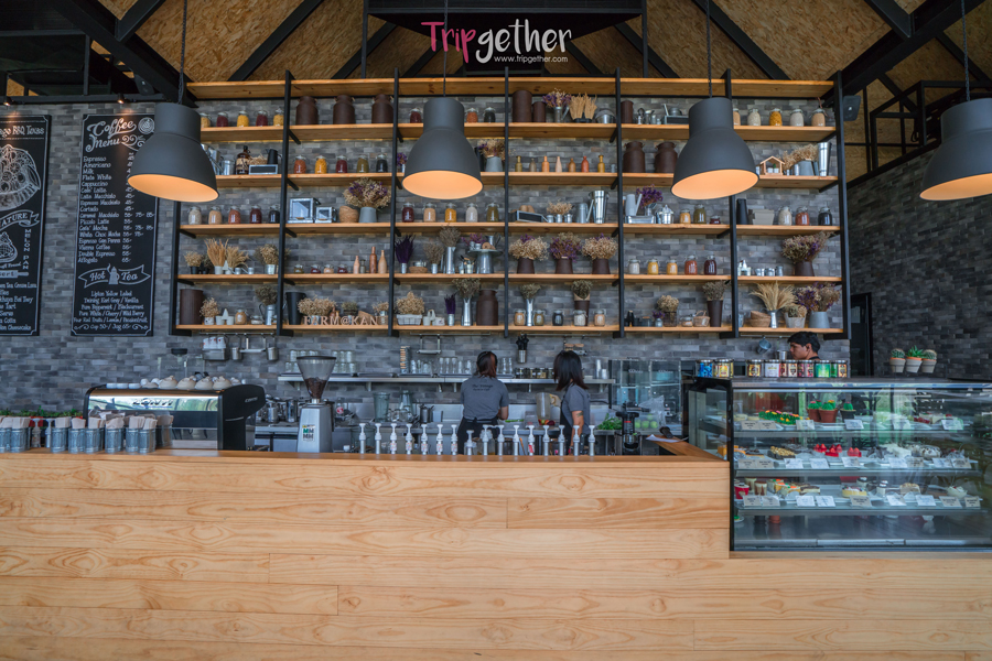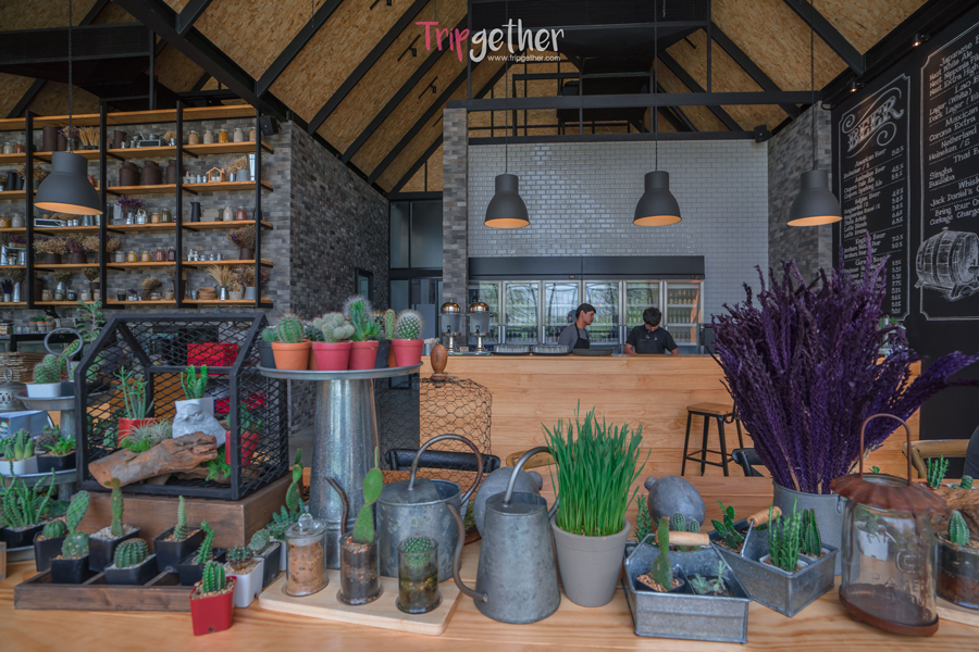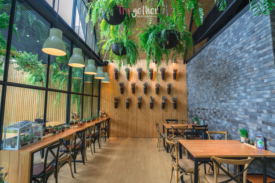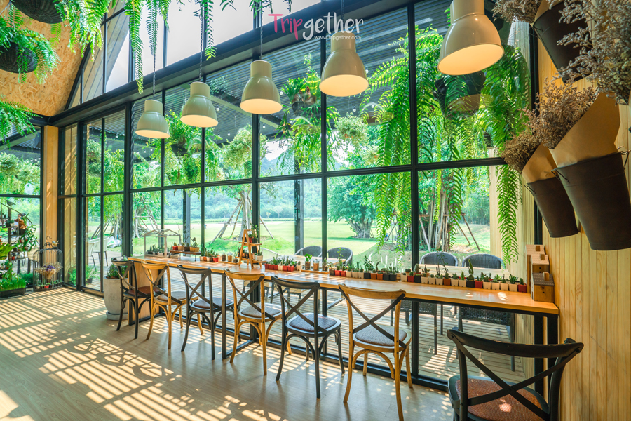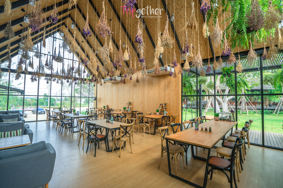 ภายในร้านตกแต่งด้วยดอกไม้แห้งและ ต้นเฟิร์นห้อยประดับตกแต่งไว้อย่างสวยงาม ให้ความรู้สึกเหมือนอยู่ท่ามกลางสวนหลังบ้าน