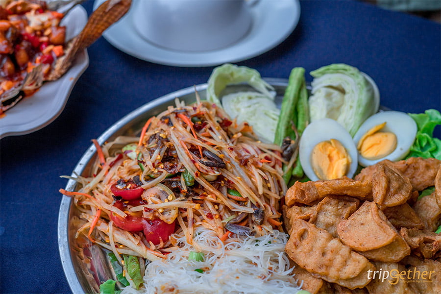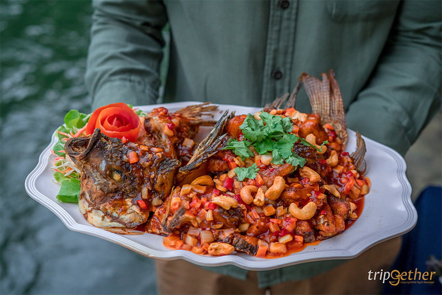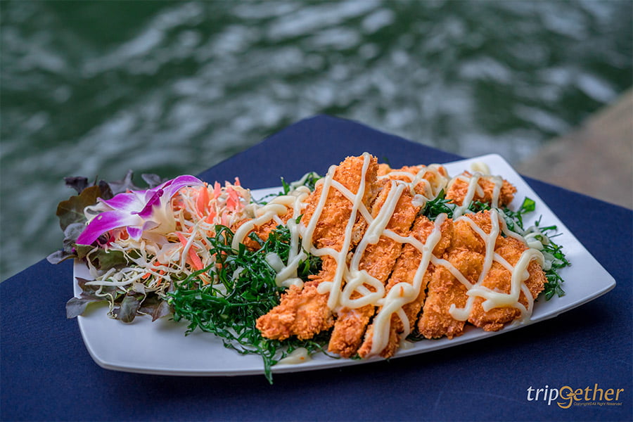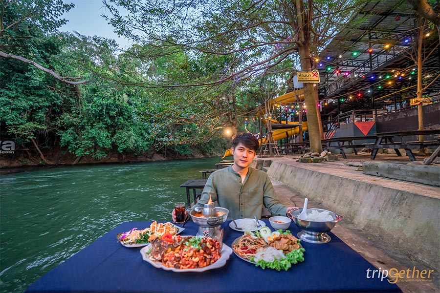เล่นน้ำพักผ่อนกันเป็นที่เรียบร้อย เราก็มาเติมพลังกับอาหารเย็นต่อกับร้านอาหารของณัฐพล รีสอร์ท แก่งกระจาน ร้านอาหารริมน้ำที่ไม่เข้าพักก็แวะมาชิมความอร่อยกันได้ เมนูเด็ดแนะนำมาแล้วต้องลองคือ ไก่ทอดณัฐพล 180 บาท, ปลาสามรส 400 บาท, แกงส้มชะอมกุ้ง 200 บาท และส้มตำถาดเล็ก 199 บาท