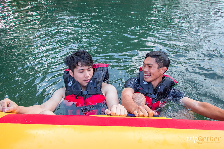 กิจกรรมแรกที่มาถึงแล้วต้องเล่นเลยก็คือ สไลด์เดอร์วนสีเหลืองขนาดใหญ่ ที่ตั้งเด่นอยู่ริมธารน้ำ แต่ก่อนจะเล่นกิจกรรมทางน้ำทุกครั้งจะต้องใส่ชูชีพก่อนทุกครั้งนะจ๊ะ นอกจากนี้ที่นี่ยังมีให้นั่งเรือยางล่องแก่งแบบเหมาลำ นั่งได้ตั้งแต่ 8-10 คนในราคา 1,200 บาท อีกด้วย