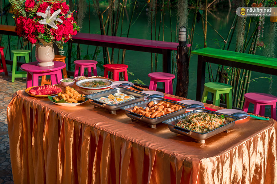 ส่วนอาหารเช้าทางรีสอร์ทจะจัดเป็นไลน์บุฟเฟ่ต์ เปิดให้บริการตั้งแต่ 7.30 – 10.00 น. มีเมนูอาหารให้เลือกรับประทารกันแบบเต็มอิ่มไม่ว่าจะเป็นข้าวต้ม ข้าวผัด ไส้กรอก ไข่ดาว ปาท่องโก๋ กาแฟ โอวัลติน และผลไม้ตามฤดูกาล