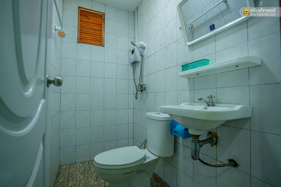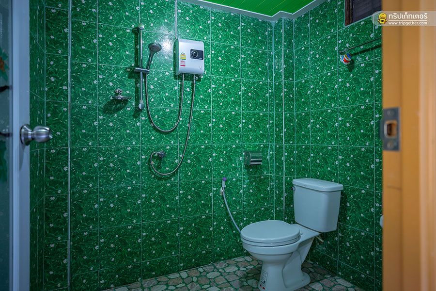 และยังมีห้องน้ำในตัว มีเครื่องทำน้ำอุ่น สบู่ และผ้าขนหนูที่จัดเตรียมไว้ให้อย่างพร้อมสรรพ